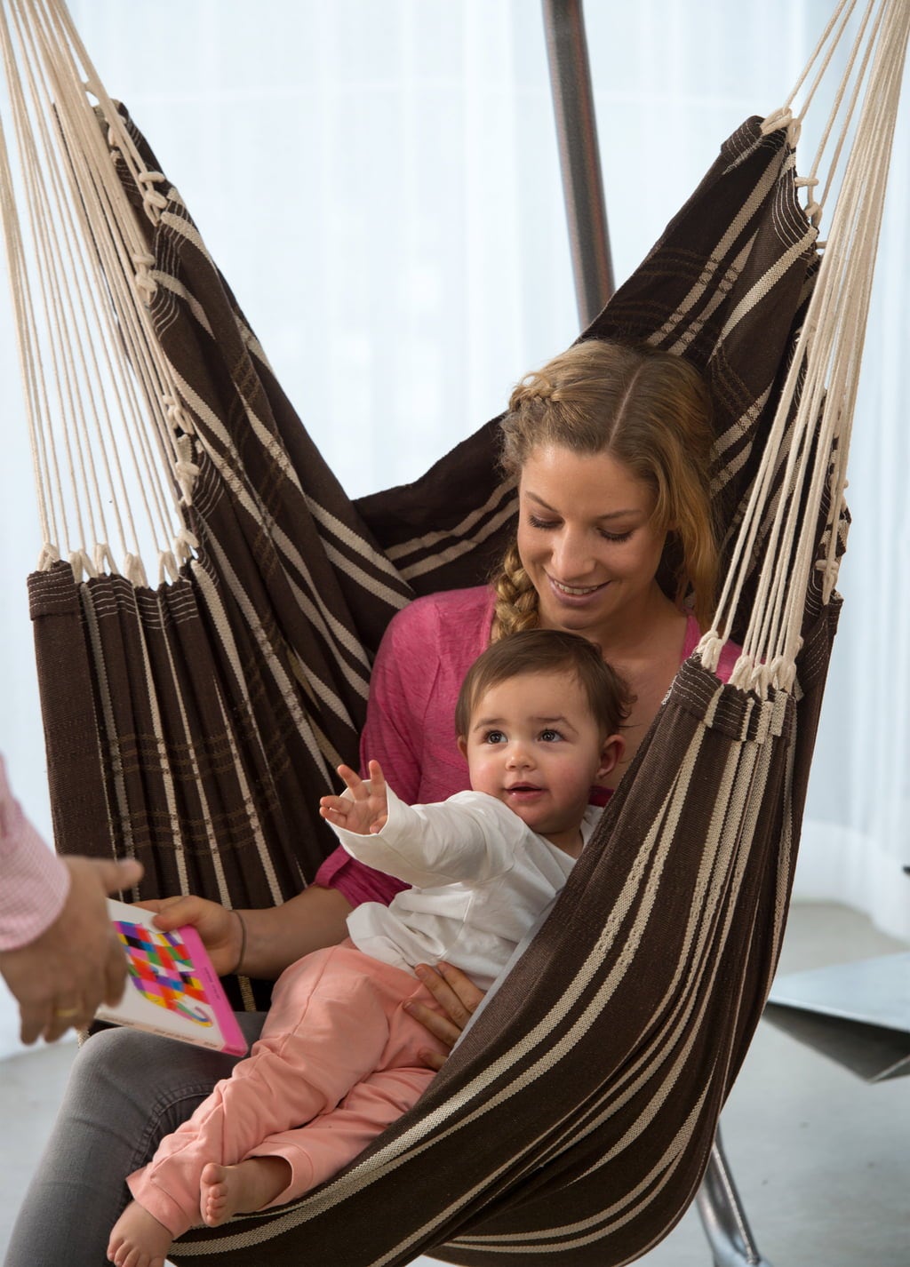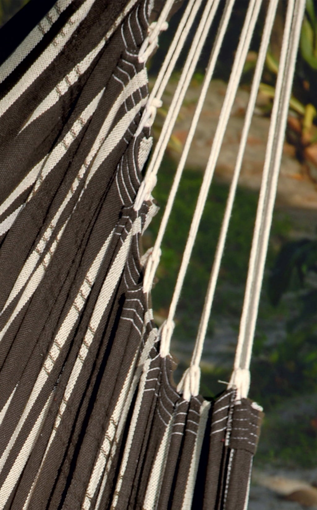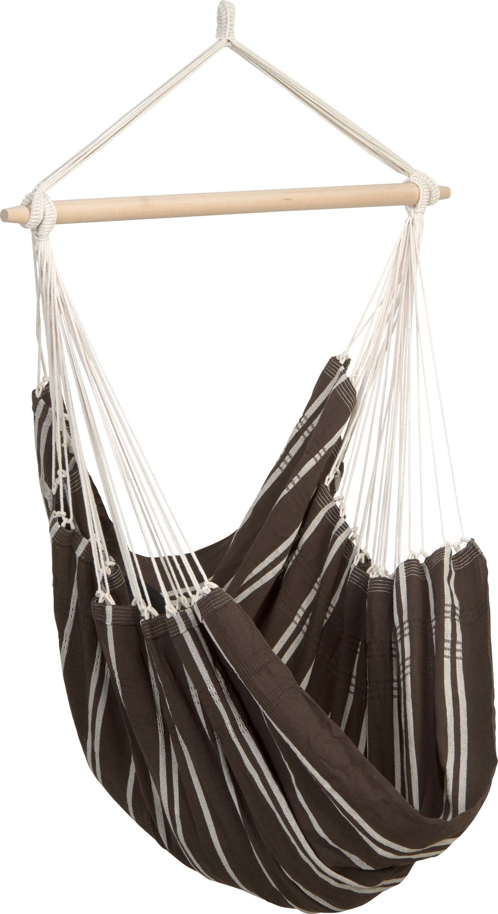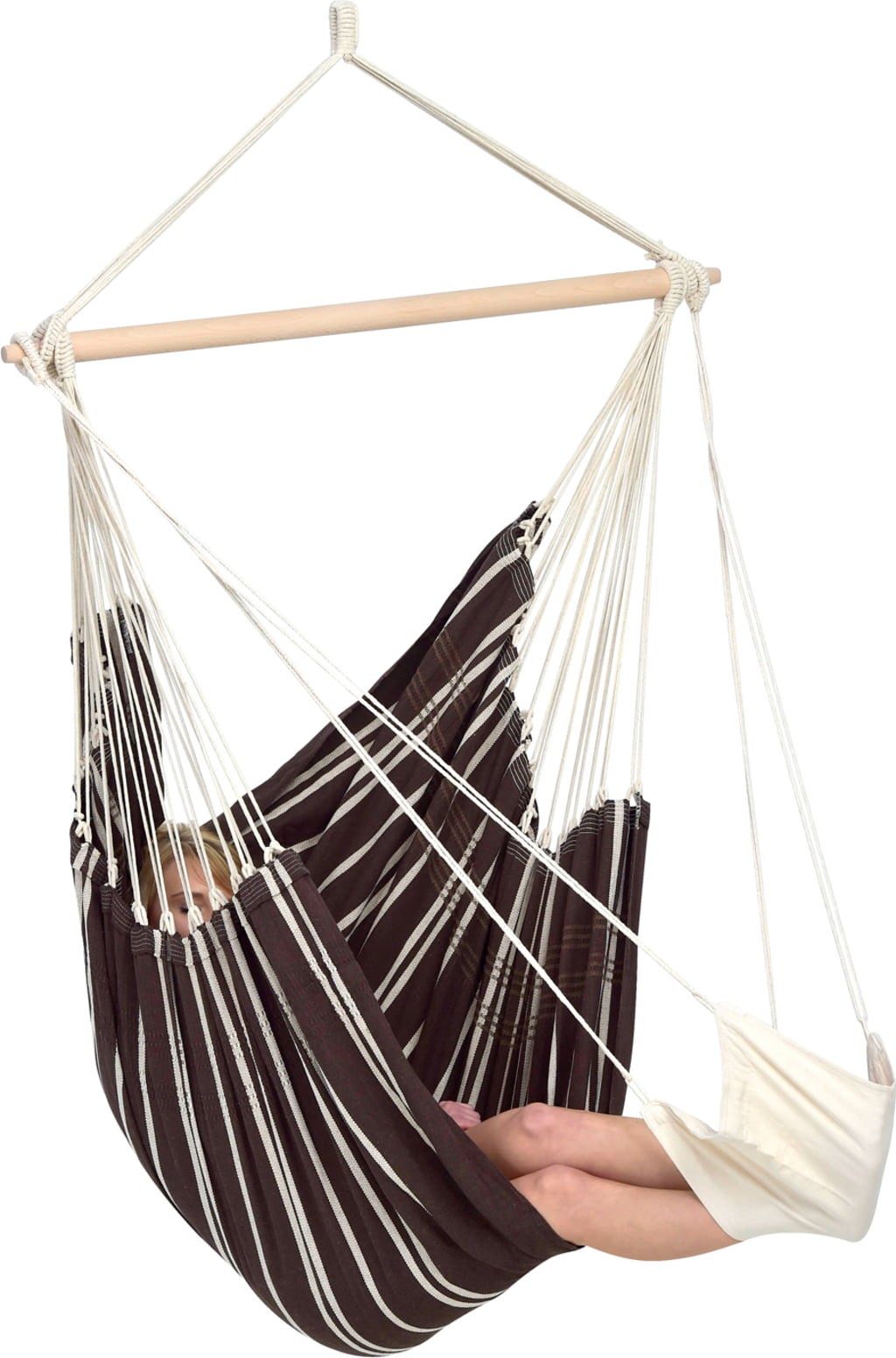 Dankzij de vele ophangkoorden wordt je gewicht gelijkmatig verdeeld zodat je een echt gevoel van gewichtloosheid ervaart. Een beukenhouten spreidstang zorgt voor de nodige stabiliteit. Om ervoor te zorgen dat de koorden echt blijven zitten waar ze horen, zijn er praktische inkepingen aan de uiteinden van de houten balk om te voorkomen dat ze wegglijden. De extra dikke koorden en de handgeweven, dubbel 5-gestikte oogjes maken de fauteuil bijzonder robuust en duurzaam. De extra dichte 400 g/m² geweven stof kan gemakkelijk tot 150 kg dragen. Zo zie je maar, je kunt het jezelf echt gemakkelijk maken in deze hangstoel en je gedachten de vrije loop laten!