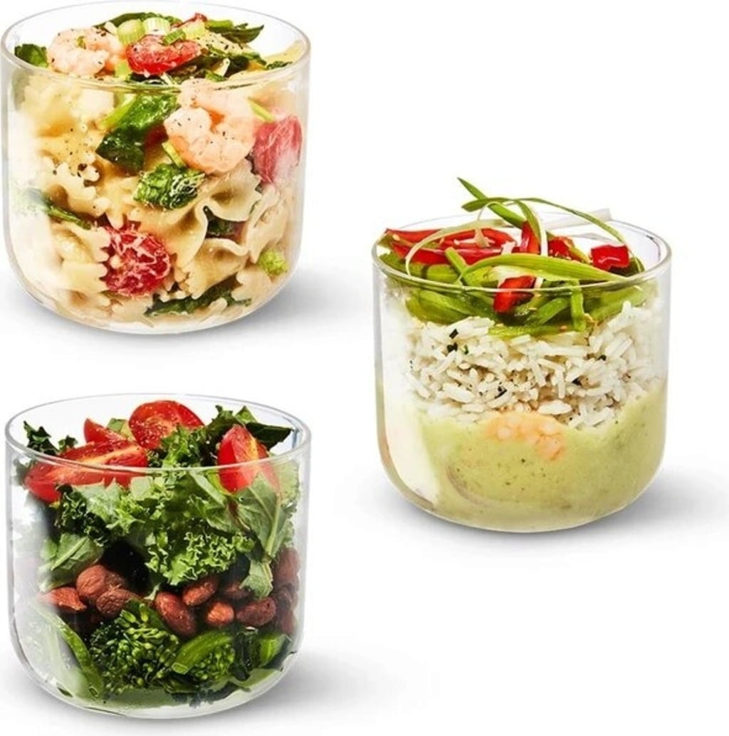 Praktische lunchschaal van temperatuurbestendig borosilicaatglas met siliconen deksel. Extra beschermd door een deksel van polypropyleen en 30% duurzame PEFC-houtvezels en een deksel van hoogwaardig roestvrij staal. Antislip siliconen inzetstuk op de bodem. Volledig lekvrij en vaatwasmachinebestendig (het beste in het bovenste vak).
