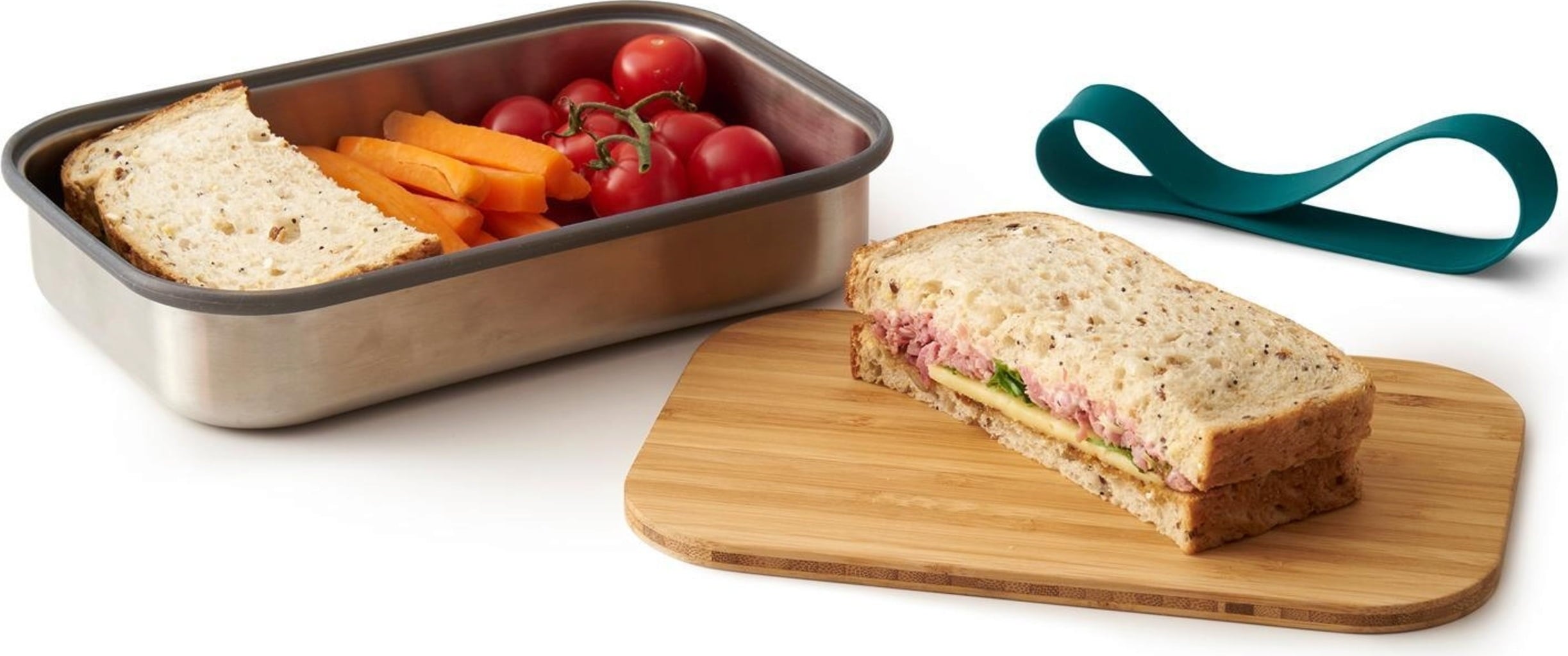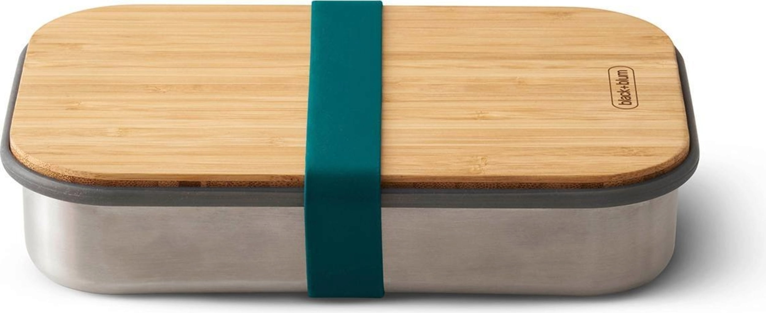 Casual roestvrijstalen lunchbox zonder plastic, ideaal voor een snelle snack tussendoor. De deksel van natuurlijk bamboe dient ook als snijplank.