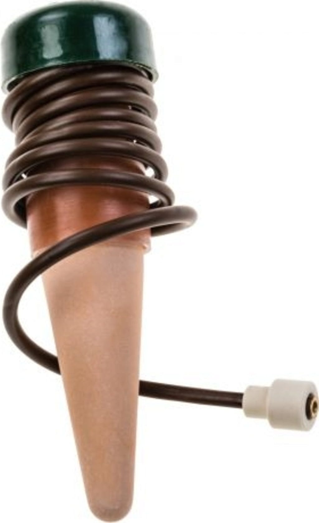 Plaats de kleikegel een paar minuten in water voordat je hem tot de rand vult met water en sluit hem. Zorg ervoor dat de aanzuigslang goed ontlucht is. Steek de kleikegel met het waterdoorlatende uiteinde in de grond. Gebruik twee stukken voor grotere potten en één stuk om de 15 tot 20 cm voor bloembakken.
