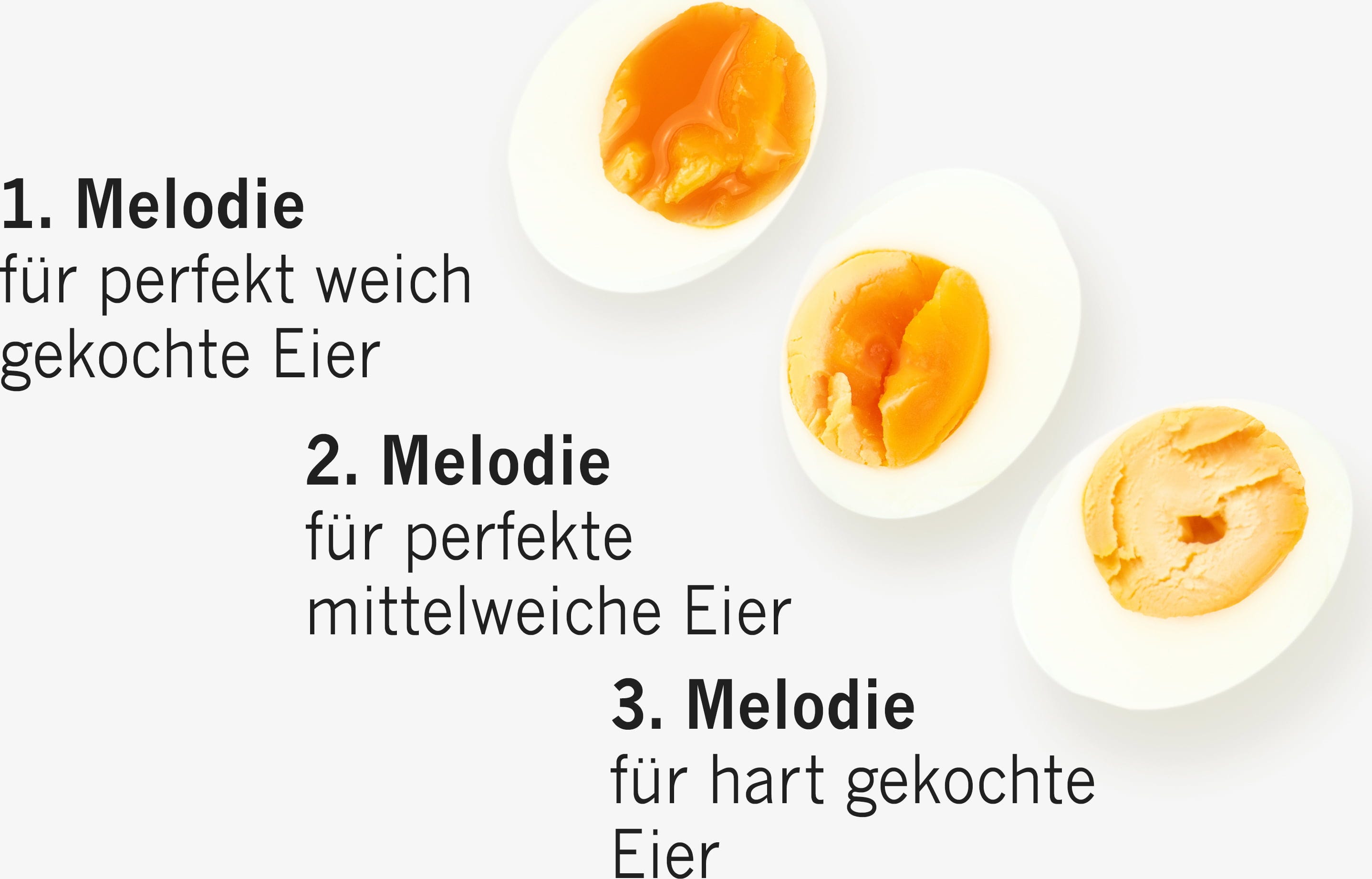 Bewaar het PiepEi gewoon samen met de eieren, kook ze samen en wacht tot de melodie van de gewenste hardheid klinkt. Het maakt niet uit met welke watertemperatuur je begint, hoe groot de eieren zijn of op welke hoogte je kookt.