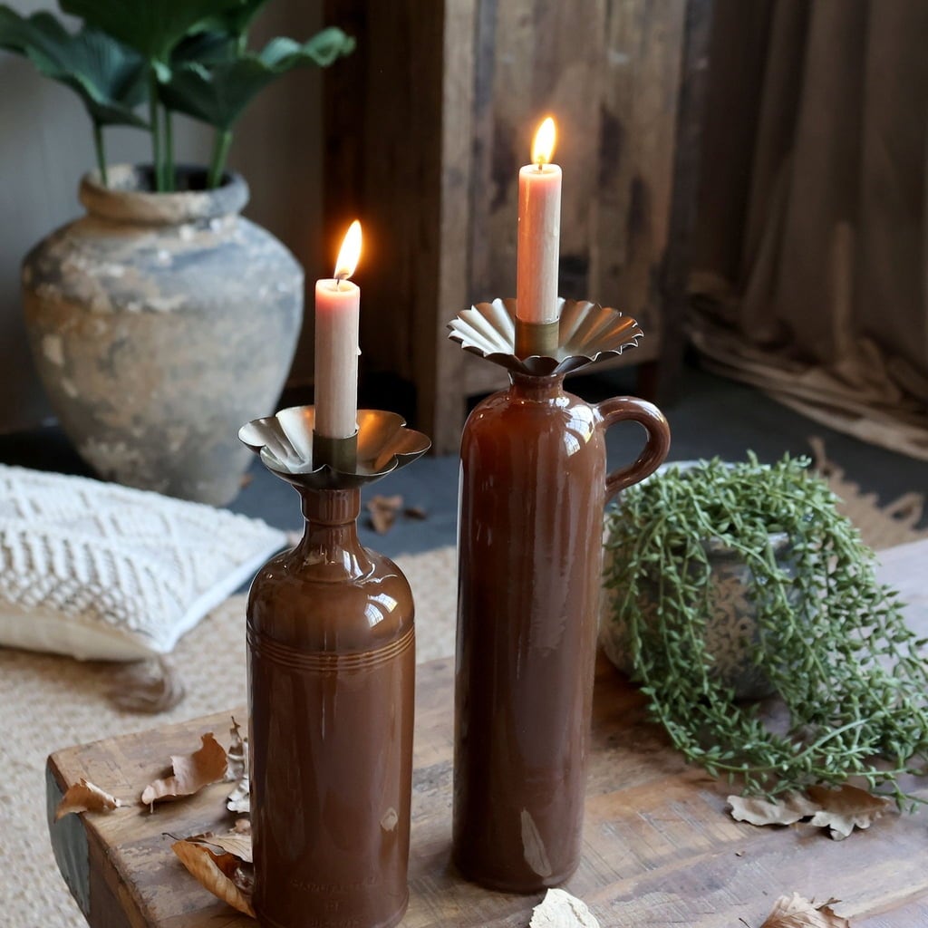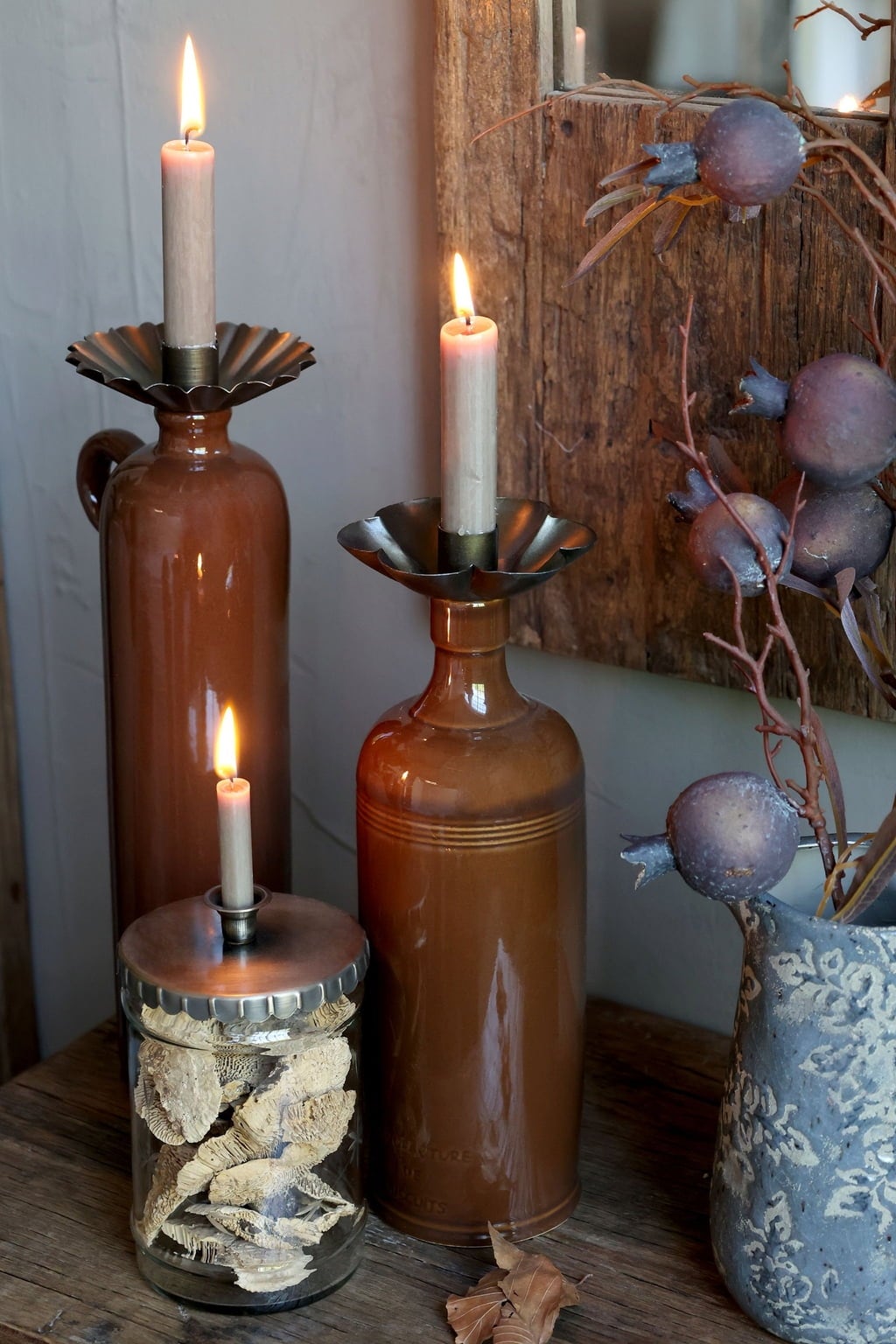 Deze robuuste ijzeren kandelaar wordt eenvoudig op lege flessen geplaatst en laat ruimte voor creatieve ontwerpideeën. De bloemvormige schaal biedt betrouwbare bescherming tegen heet kaarsvet.