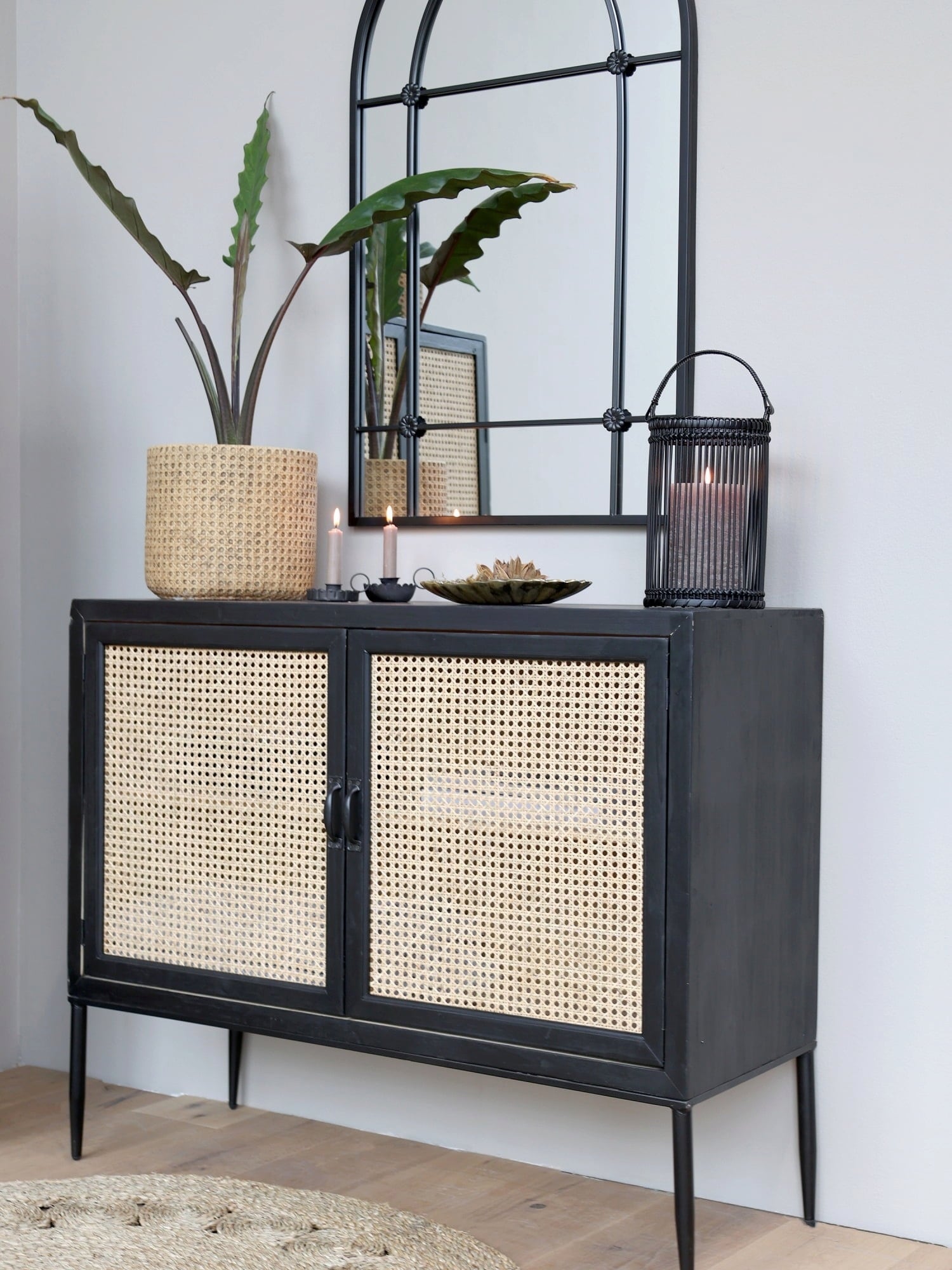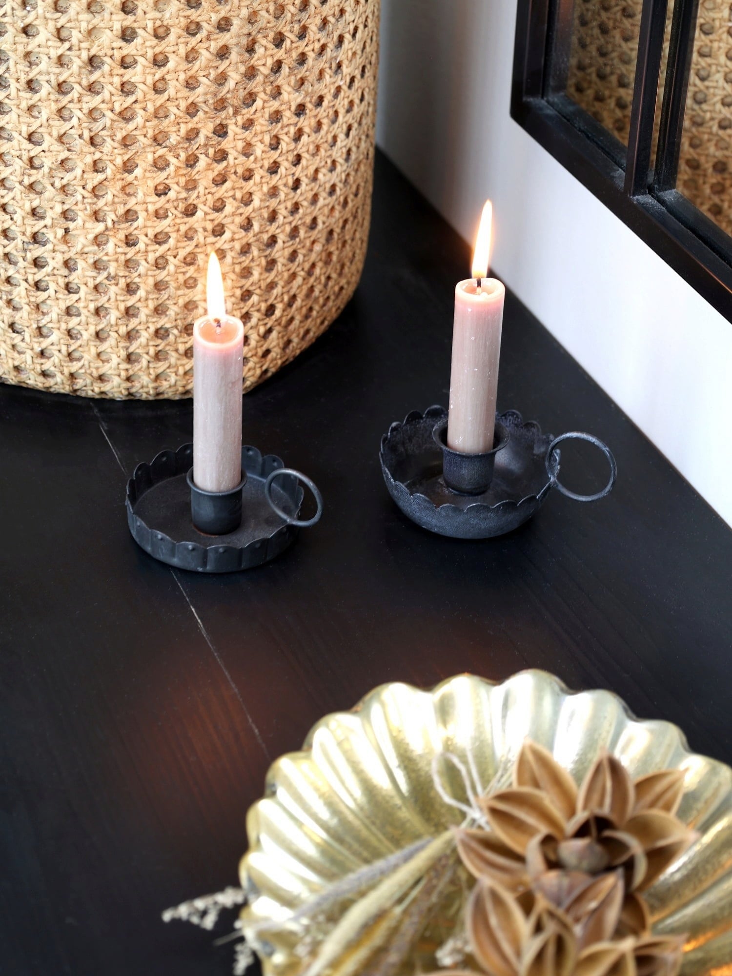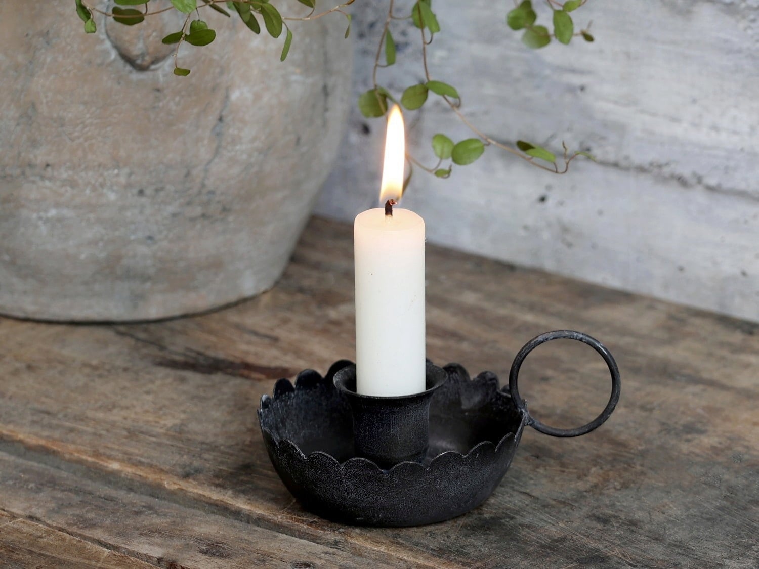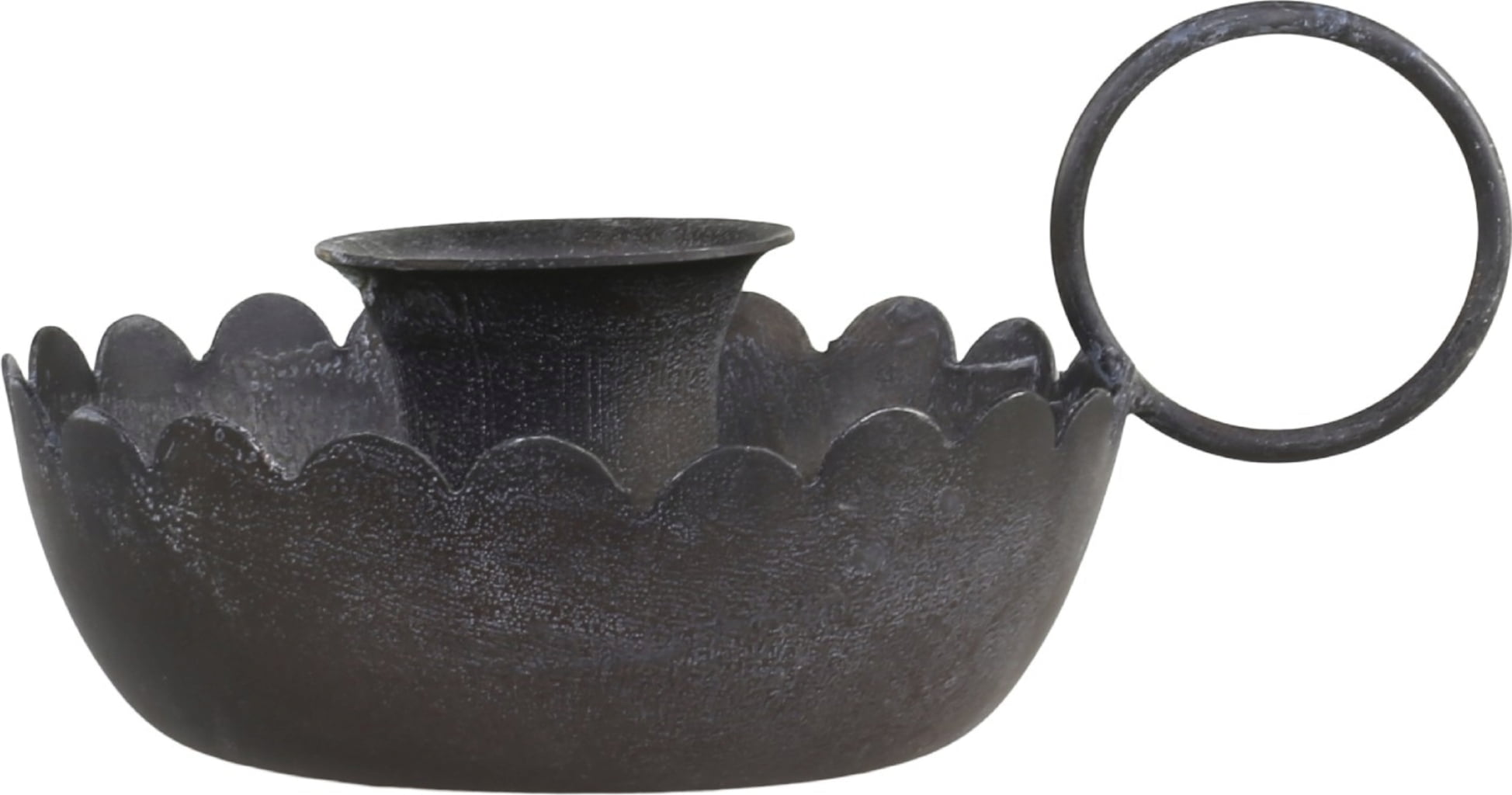Deze prachtige kandelaar heeft een ijzeren frame en een praktisch handvat aan de zijkant. De antieke afwerking in zwarte tinten geeft het elegantie en charme.