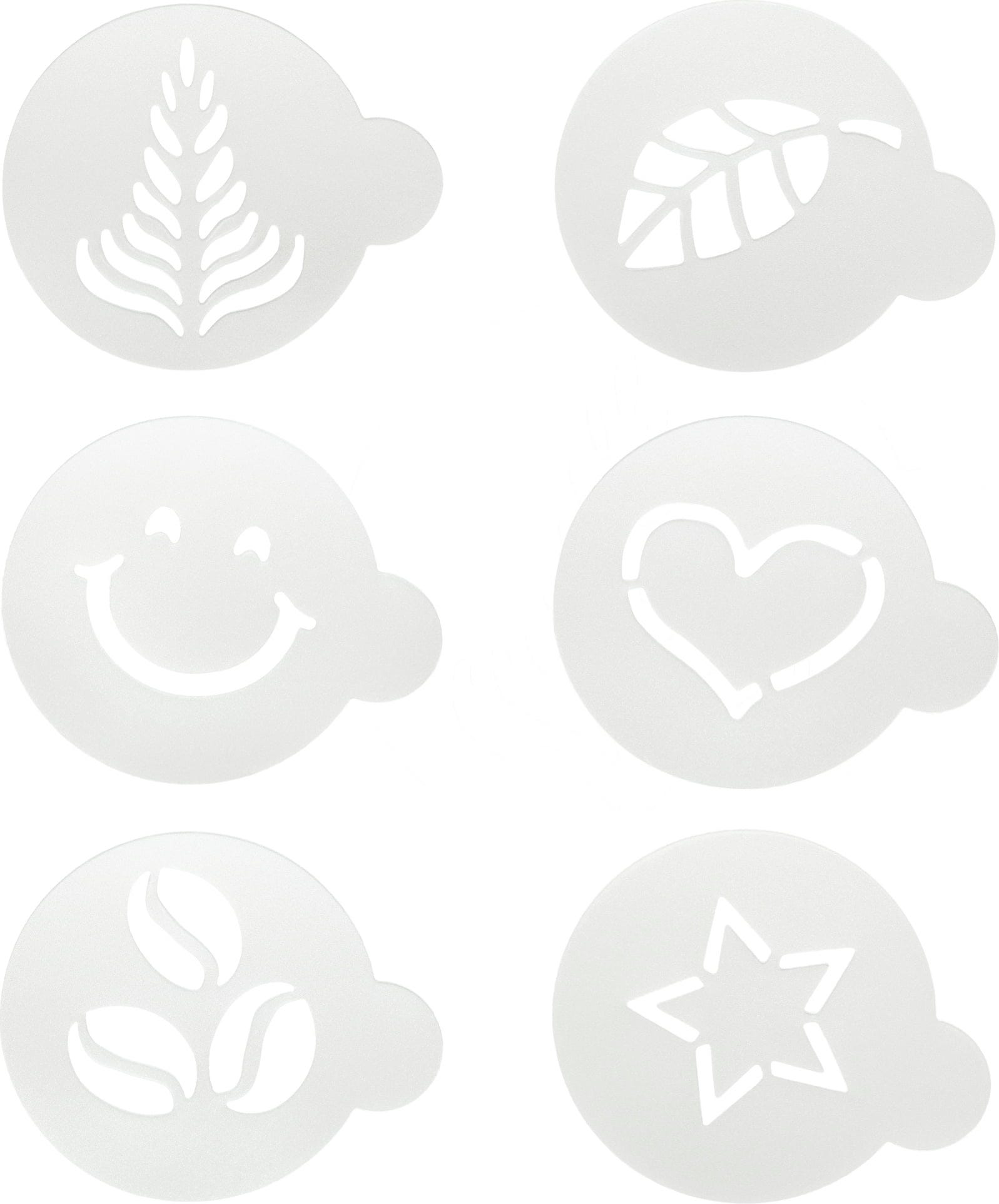 6 motieven: ster, hart, barista, gezicht, blad, koffiebonen