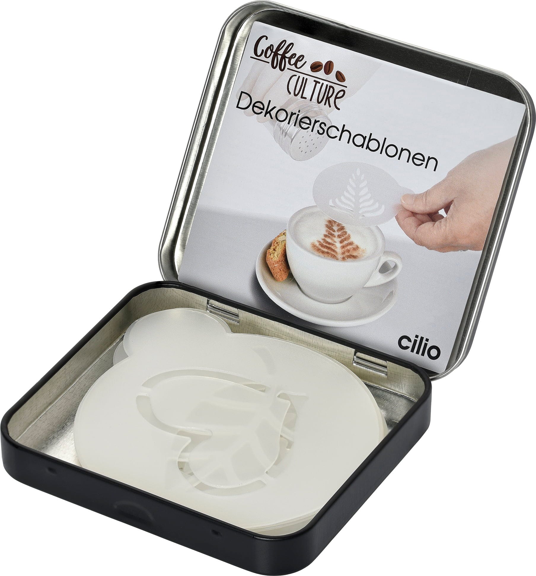 Met de cilio sjablonen kun je een thuisbarista worden en in een handomdraai kleine kunstwerkjes op je cappuccino, latte macchiato of cacao toveren. Ze zijn ook ideaal voor het versieren van desserts.