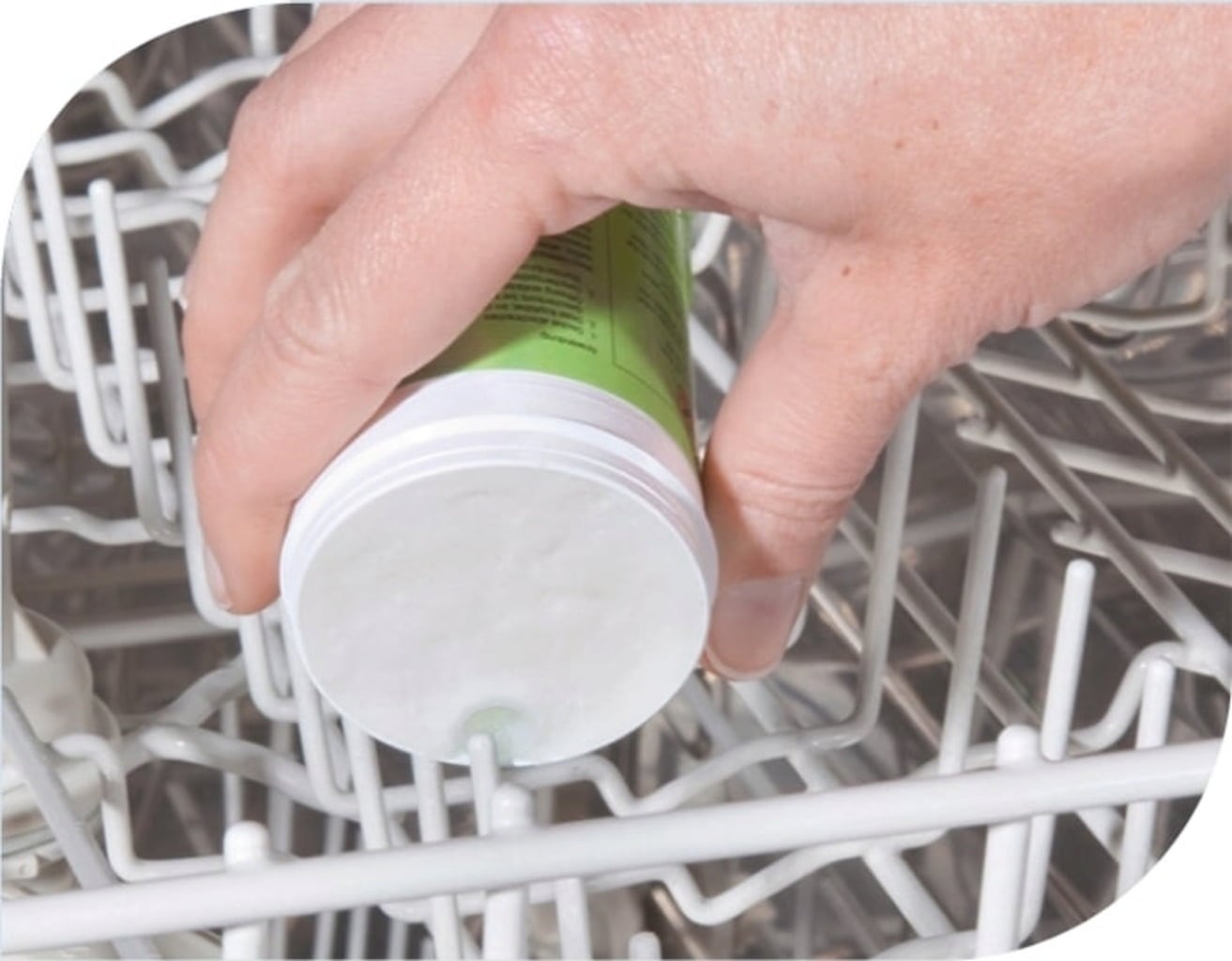 - Plaats het blikje ondersteboven in de lege vaatwasser. Om het blikje op zijn plaats te houden, steek je een van de staafjes in het kleine gaatje in het blikje.