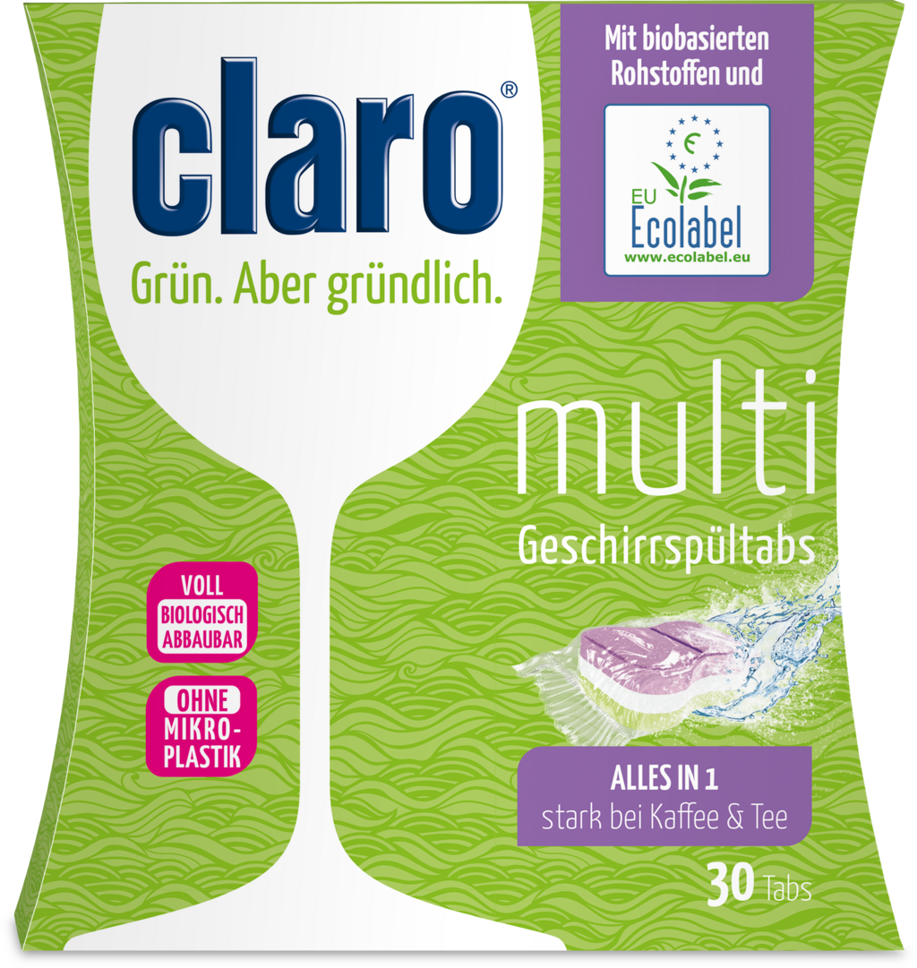 De claro Multi Tabs combineren verschillende functies in één tab, waardoor je geen extra producten nodig hebt! Ze bevatten een zout- en glansspoelfunctie en zijn uiterst effectief tegen alle soorten vuil. Door het hoge bleekgehalte verwijderen ze ook effectief opgedroogde koffie- en theevlekken. Bovendien bevatten ze actieve zuurstof, een anti-kalkfunctie en dragen ze bij aan de machinehygiëne.