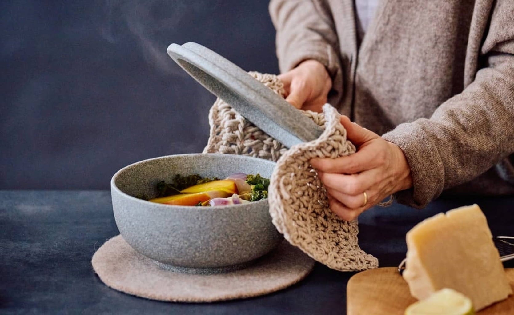 • Afdekking kan zowel als deksel en als serveerschaal worden gebruikt, waardoor de groenten lang warm blijven