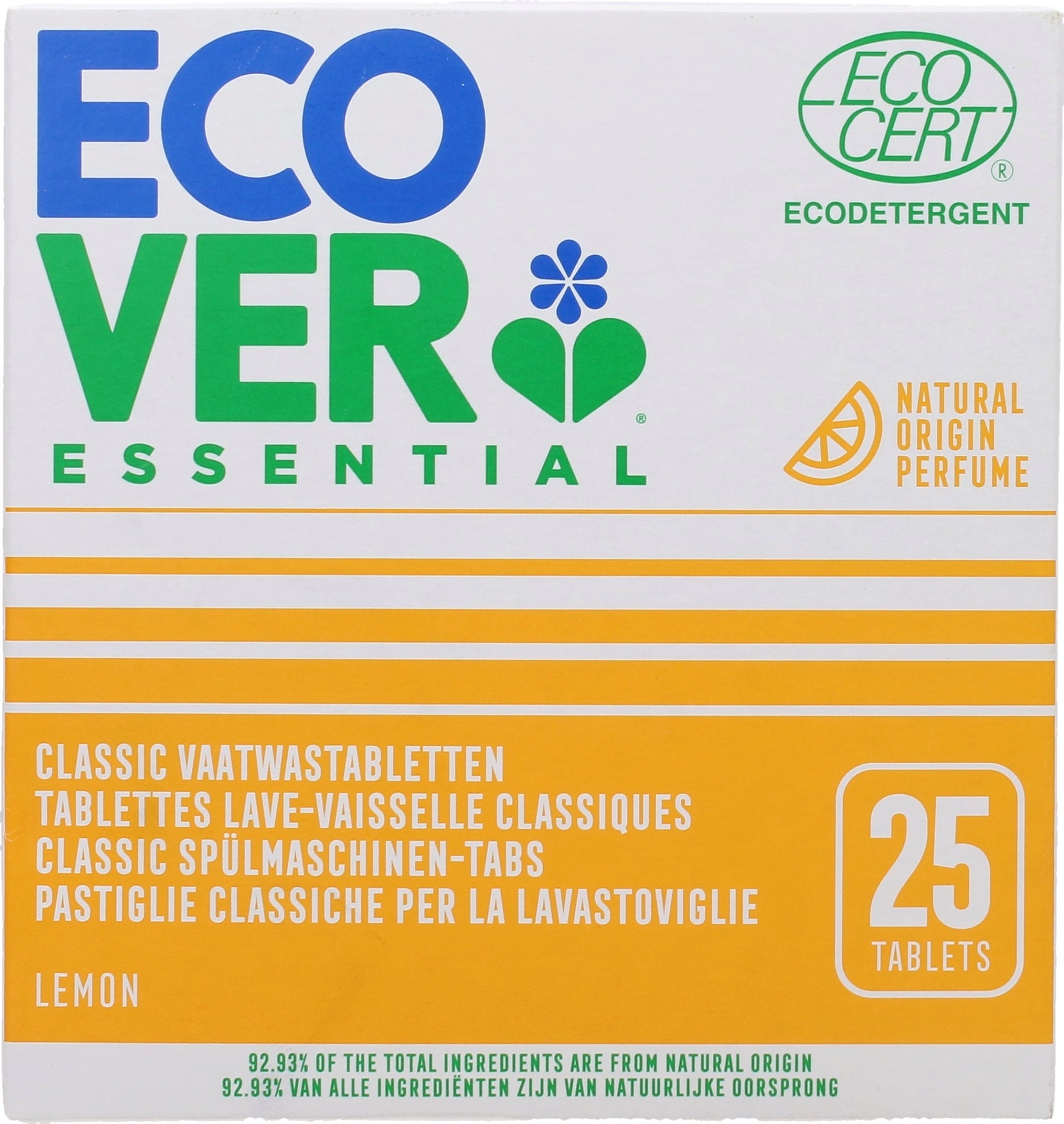 De vaatwastabletten uit de Essential productlijn van Ecover kenmerken zich door hun hoge reinigingskracht op basis van plantaardige en minerale ingrediënten. De citrusgeur is gebaseerd op natuurlijke geuren.