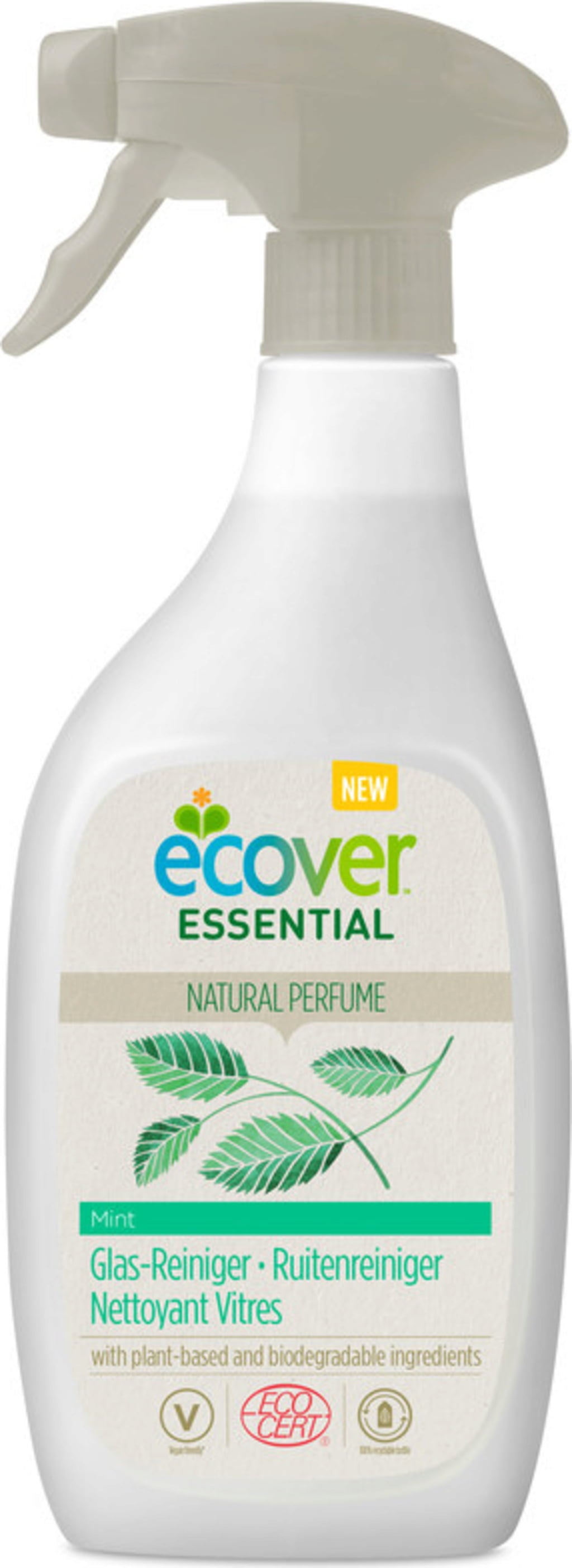 De glasreiniger uit de Essential-productlijn van Ecover zorgt voor een streeploze glans op basis van plantaardige en minerale ingrediënten. Het product laat een frisse muntgeur achter op basis van puur natuurlijke geurstoffen.