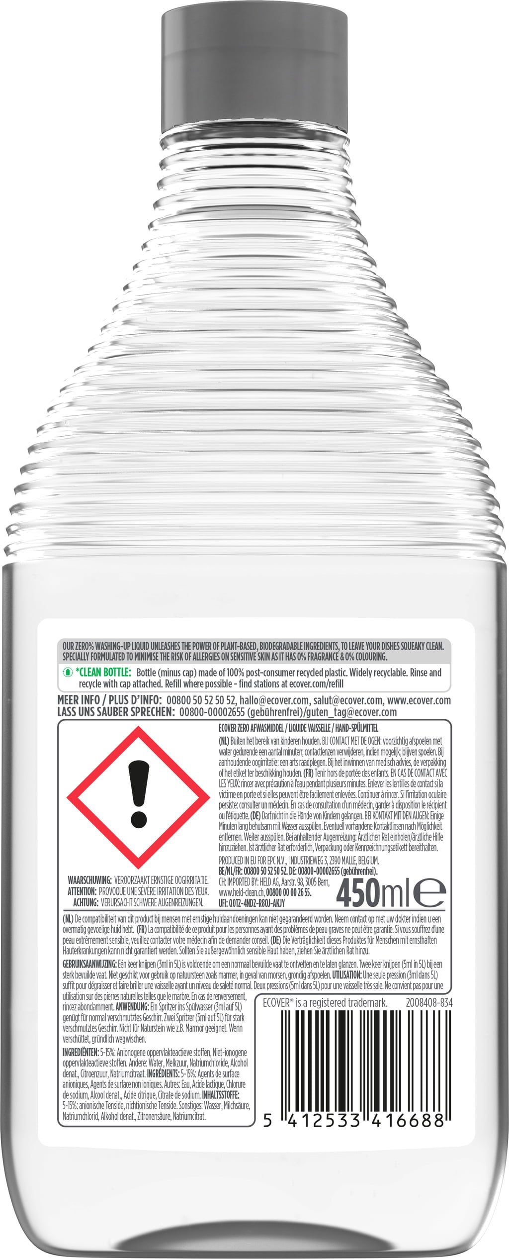 De Ecover ZERO handafwasmiddel is vrij van geur- en kleurstoffen en is ook geschikt voor mensen met een gevoelige huid. Het reinigt en ontvet krachtig en zorgt voor schoon servies en sprankelende glazen.