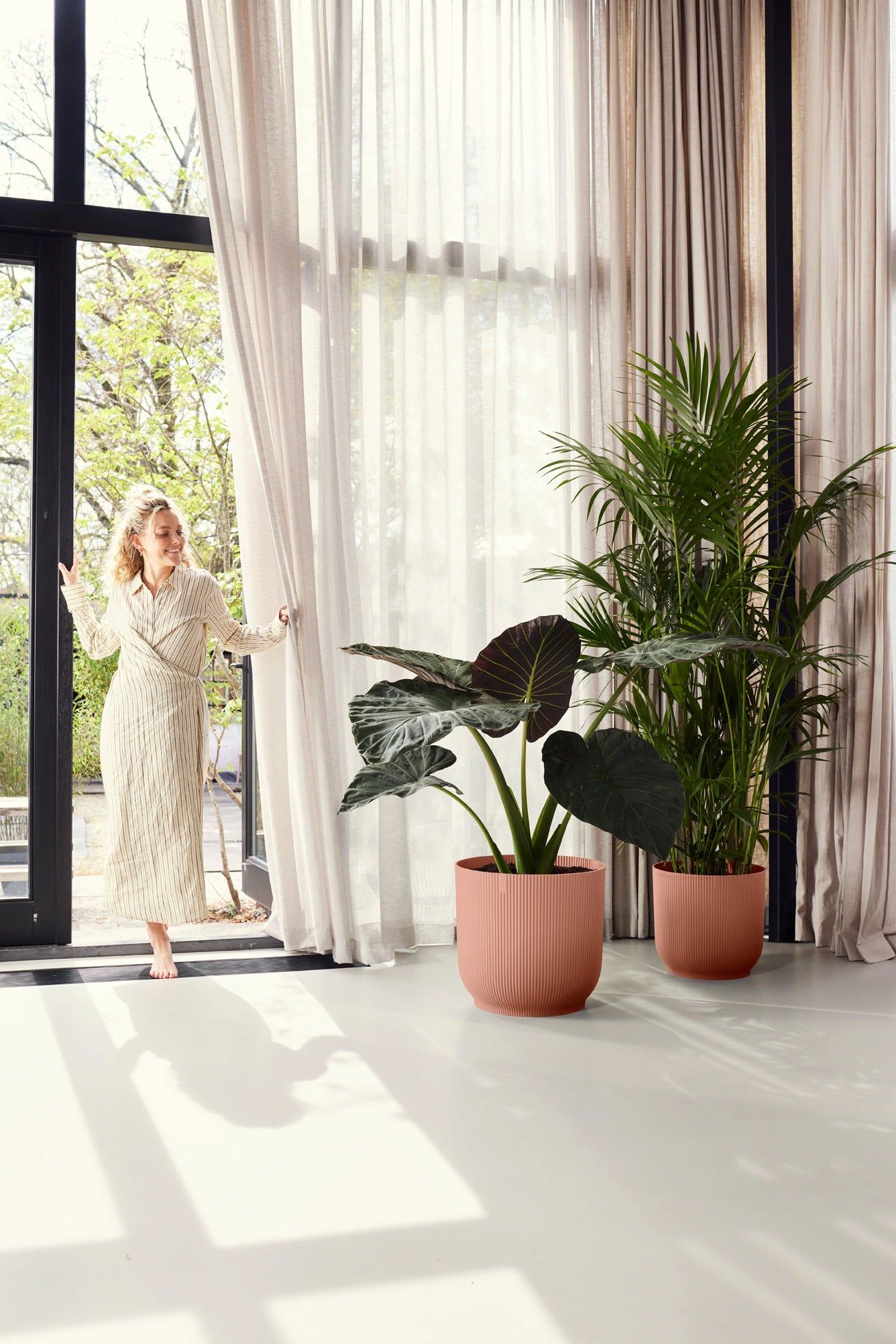 De tijdloos eenvoudige vorm en het decoratieve gegroefde patroon maken van deze gerecyclede plastic bloempot een stijlvolle blikvanger en een elegante omlijsting voor je kamerplanten. Een moderne manier om je huis groener te maken.