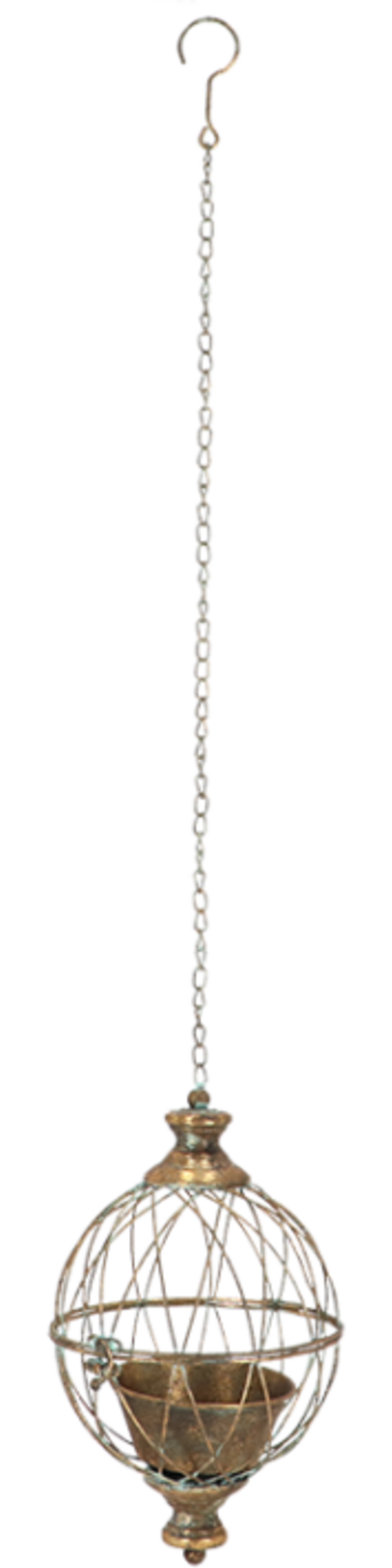 Deze bolvormige plantenbak maakt indruk met zijn verouderde metalen optiek in een zachte goudtint met een verfijnde koperen look. Hij is ideaal voor hangplanten en voegt een stijlvol accent toe aan balkons, patio's of interieurs. De plantenbak is geschikt voor binnen en buiten en wordt geleverd met een stevige ketting om hem gemakkelijk op te hangen.