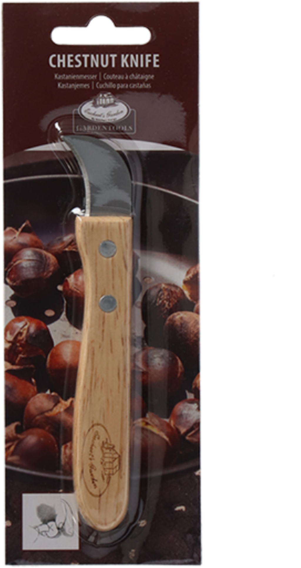 Het speciaal gevormde mes is het ideale gereedschap voor het bereiden van kastanjes. Hiermee kun je de schil in een handomdraai doorsnijden, zodat ze klaar zijn om geroosterd te worden. Het maakt het ook gemakkelijk om de binnenste schil te verwijderen. Een onmisbaar gereedschap voor de herfst en het begin van het kastanjeseizoen.