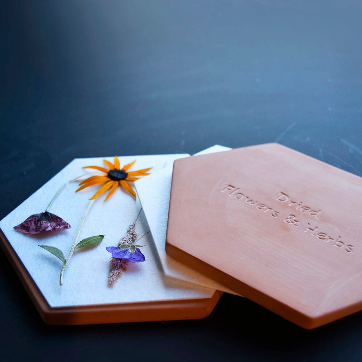 Kies de bloemen of bladeren die je wilt drogen. Leg eerst een vilten plaat op de onderste terracotta plaat. Leg er bloemen en bladeren op zoals je wilt. Plaats nu de tweede vilten plaat en vervolgens de bovenste terracotta plaat. Zet alle lagen van de pers vast met de drie siliconen banden. Plaats het nu in de magnetron.