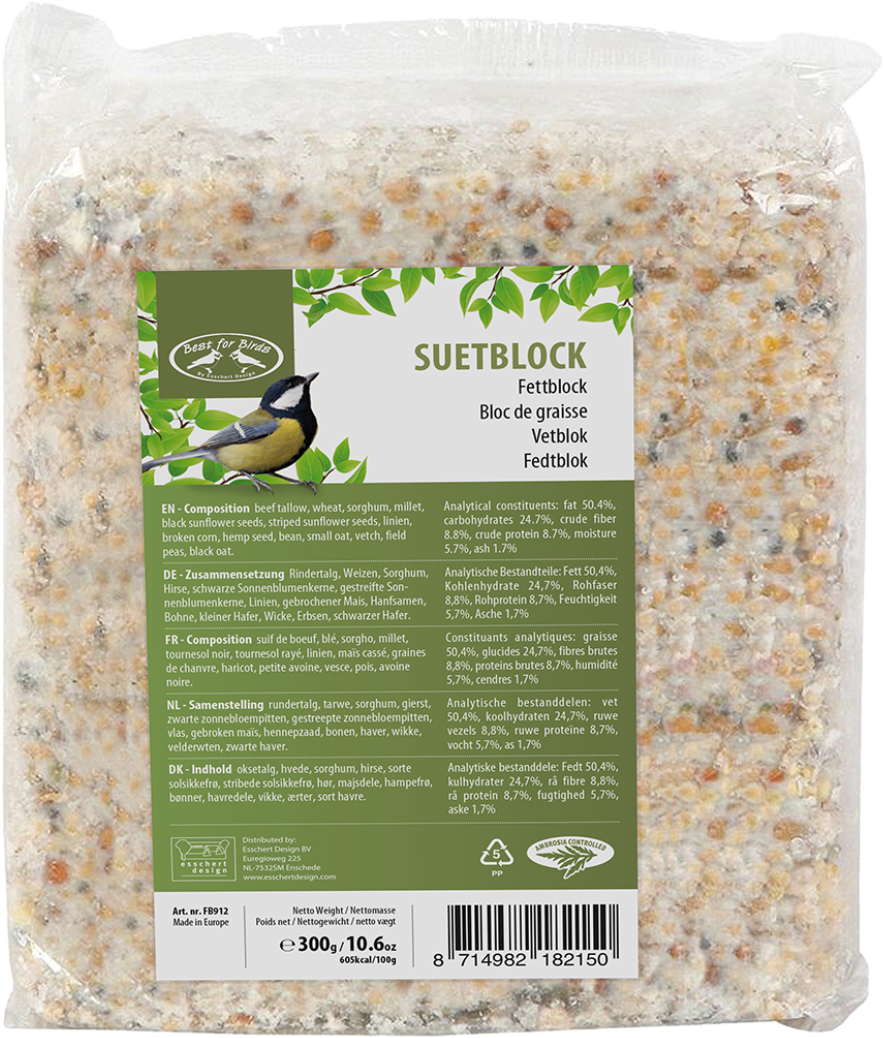 Het is bijzonder voedzaam en voorziet de dieren, vooral in de winter, van een rijke maaltijd. Het blok bestaat uit rundervet en bevat tarwe, gierst, zonnebloempitten, maïs, bonen, haver en nog veel meer.
