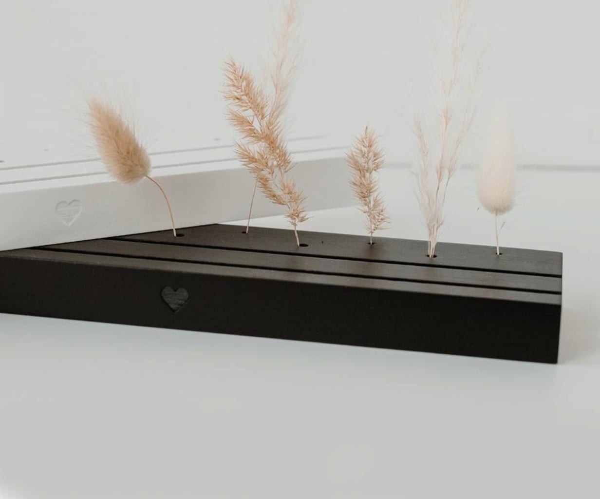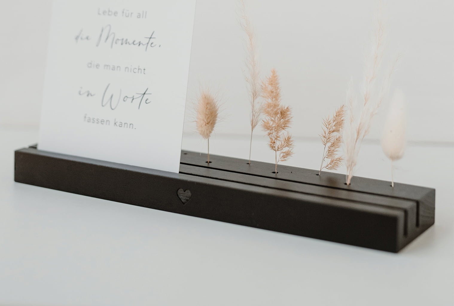 Met deze prachtige kaarten- en droogbloemenstandaard van hoogwaardig beukenhout met hartgravure kunnen je favoriete spullen en herinneringen effectief in de kijker worden gezet. Dankzij zijn lengte van 25 cm, met zijn twee kolommen en 10 kleine gaatjes, biedt hij voldoende ruimte voor droogbloemen, foto's, afbeeldingen en ansichtkaarten, die steeds opnieuw kunnen worden gerangschikt, aangevuld of geruild. Er zijn geen grenzen aan uw eigen creativiteit.