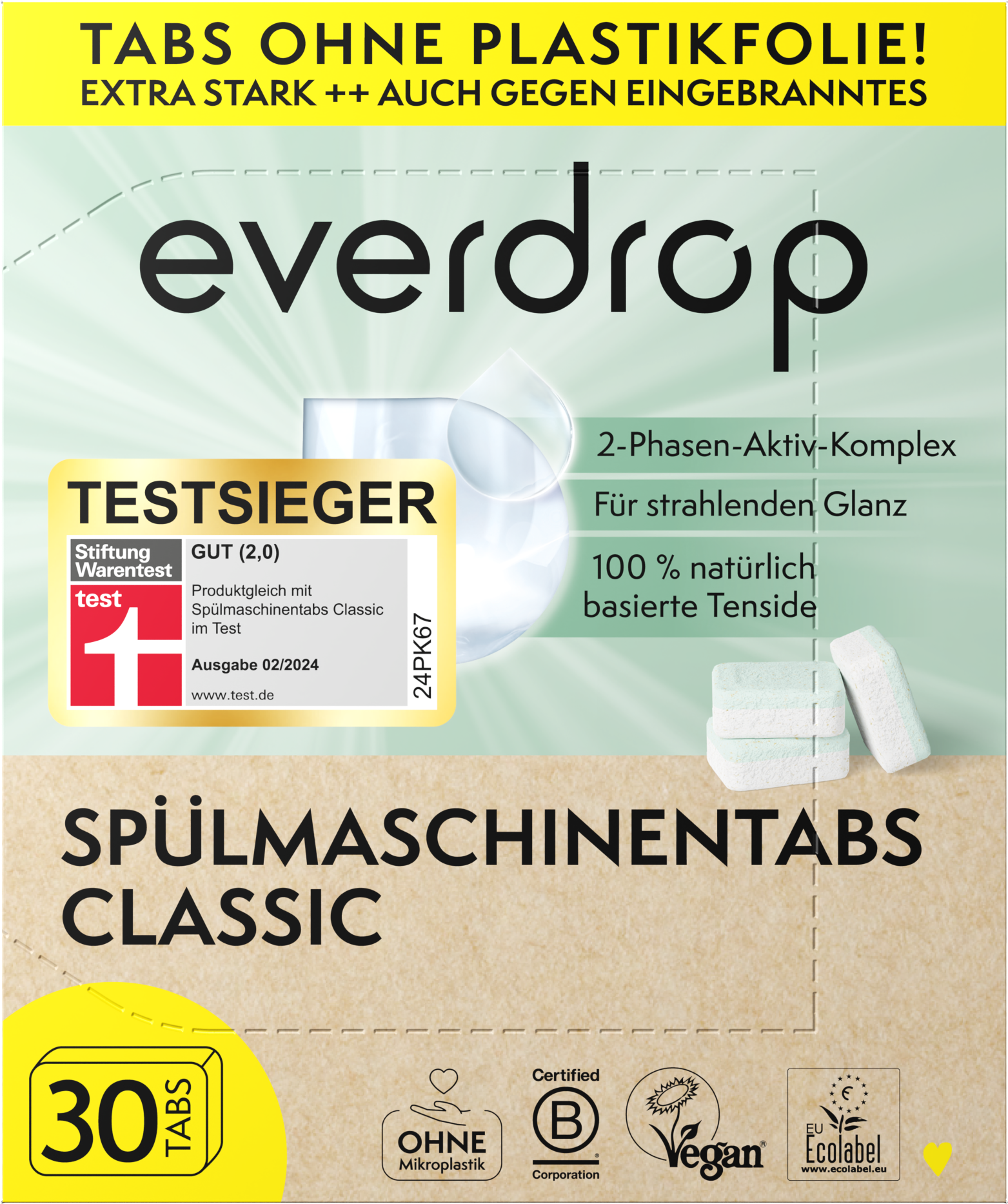Dankzij de effectieve 2-fasen actieve formule verwijderen de tabs ook hardnekkig vuil, vet, opgedroogde etensresten en aangebrand voedsel van je vaat. Ze maken gebruik van 100% plantaardige oppervlakteactieve stoffen die niets anders dan streeploze reinheid achterlaten. Bovendien zijn de tabs niet alleen vegan, maar ook vrij van microplastics, fosfaten, fosfonaten, chloor en benzotriazool.