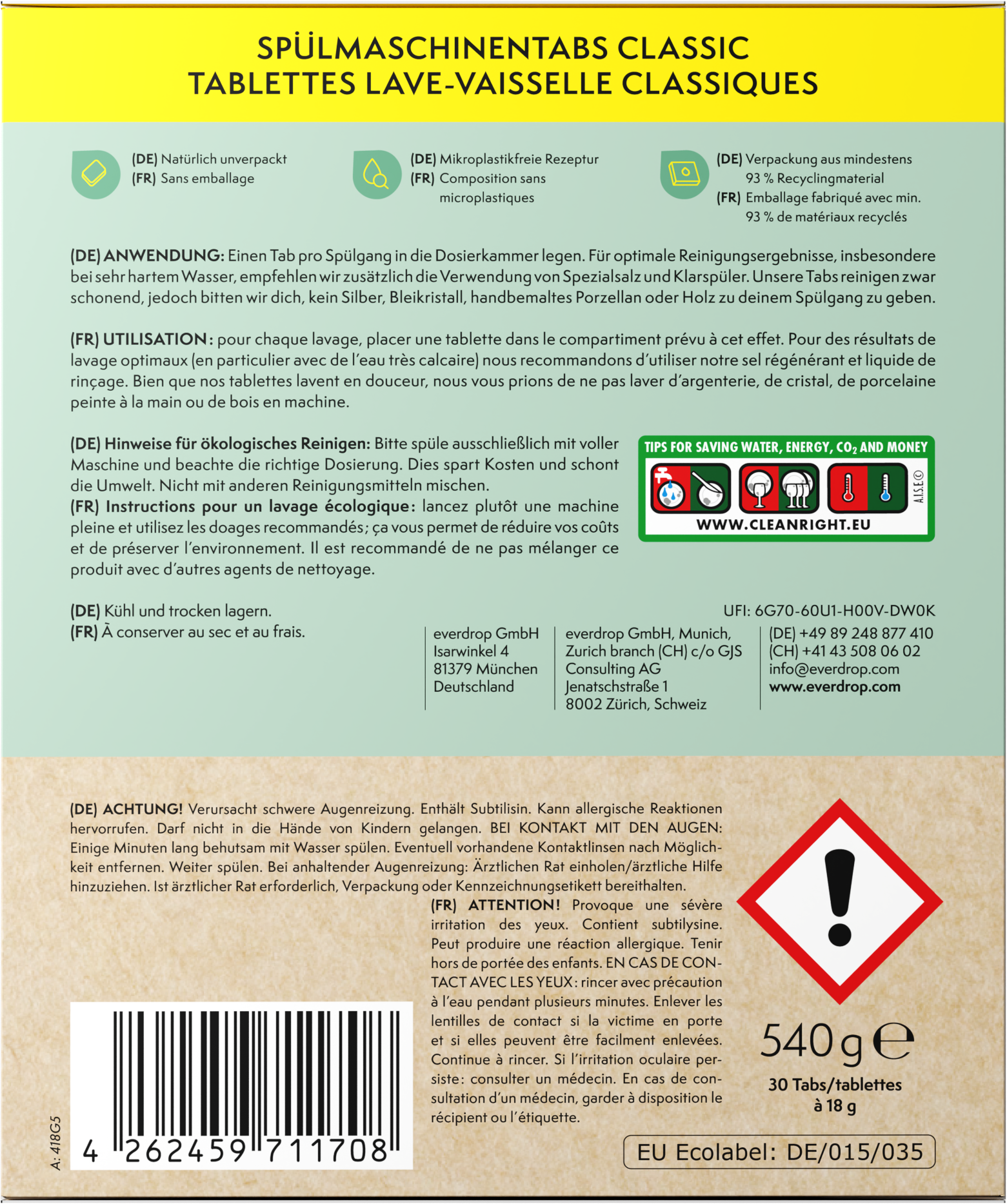 De afzonderlijke tabletten zijn niet verpakt in plastic of PVA-folie, maar komen bij je thuis in een duurzame verpakking van minstens 93% gerecycled materiaal - de verpakking kan vervolgens volledig en eenvoudig worden gerecycled in oud papier!