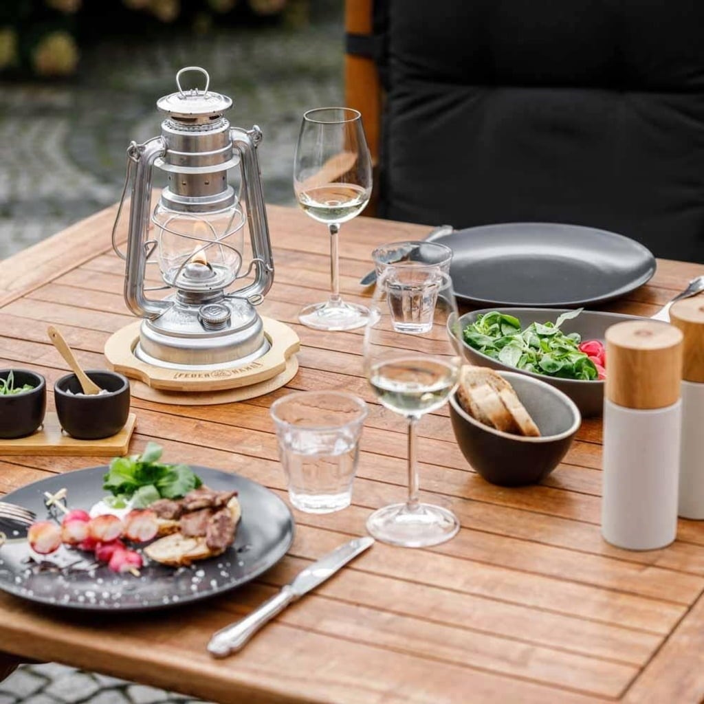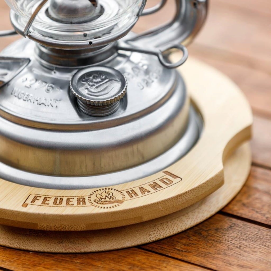 De onderzetter van hoogwaardig bamboe ziet er niet alleen geweldig uit, maar zorgt ook voor een veilige en stabiele standaard voor je Baby Special 276 stormlantaarn.