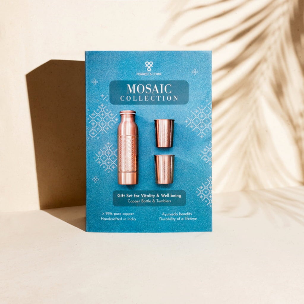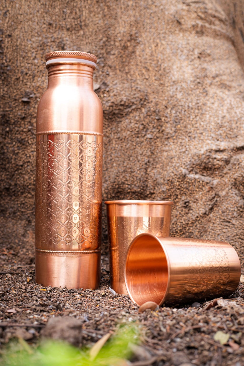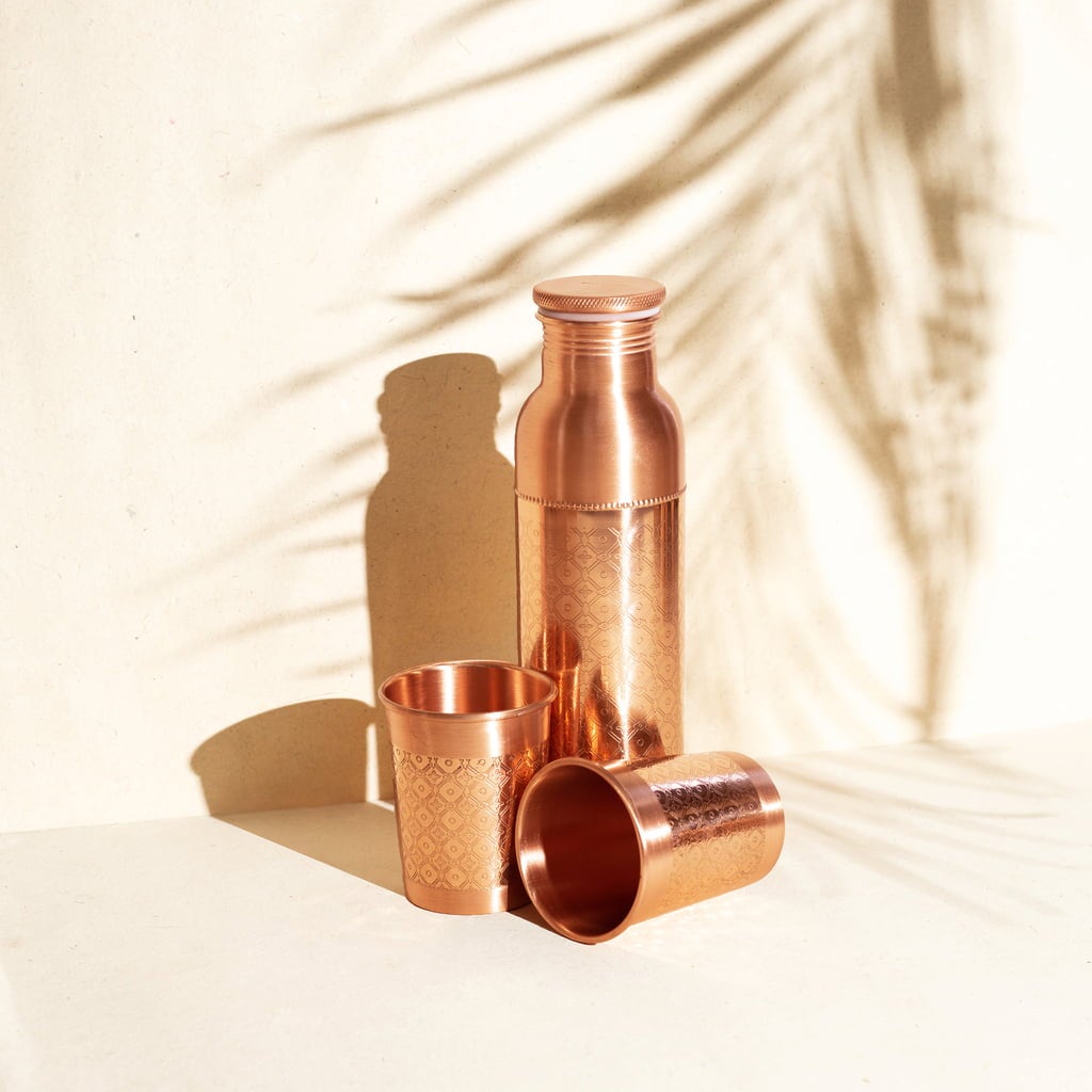 Dit betoverende ontwerp is geïnspireerd op paleisachtig houtwerk en maakt indruk met zijn delicatesse, benadrukt door de koperen afwerking. De fles en de 2 kopjes zijn unieke handgemaakte stukken. De koperen collectie is een mooi geschenk dat lang meegaat.