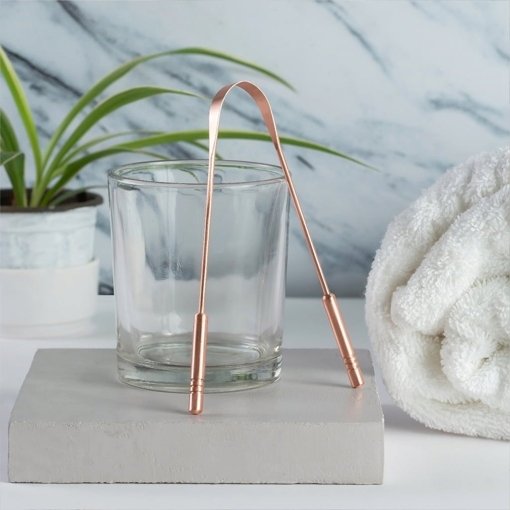 De Ayurvedische traditie van tongreiniging wordt al lang beschouwd als de perfecte aanvulling op het tandenpoetsen. De tongreiniger bestrijdt een slechte adem, verbetert de smaakzin en gaat afzettingen tegen. De antibacteriële eigenschappen van puur koper verwijderen voorzichtig bacteriën en gifstoffen die zich 's nachts ophopen en neutraliseren de mondflora. De gladde, brede zijkanten en flexibele grip bieden een aangename en comfortabele reinigingservaring die in je ochtendroutine kan worden opgenomen. Een effectieve reinigingstool voor een stralende glimlach.