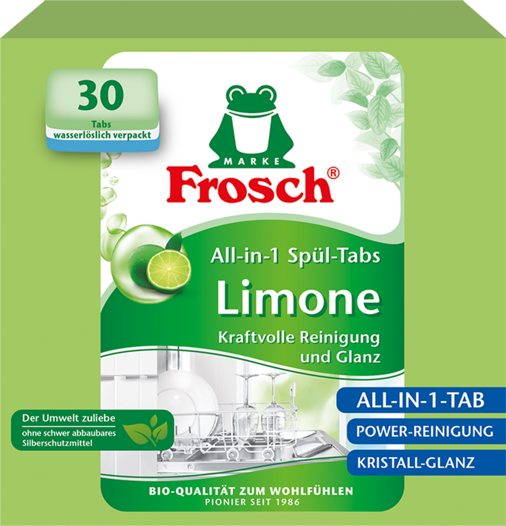 De All-in-1 Limoen Vaatwastabletten van Frosch maken gebruik van limoenextracten om zelfs hardnekkige korsten en vet in een handomdraai te verwijderen, terwijl ze een fijne limoengeur verspreiden.