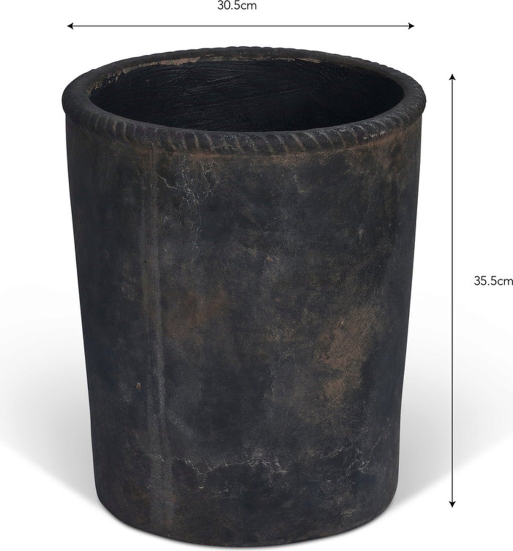Deze rustieke pot is voorzien van handgemaakte decoraties op de rand, waardoor elke pot uniek is. Met zijn ingetogen antiekbruine kleur past hij perfect in elk interieur en is hij ideaal voor grotere planten of kleine kamerbomen.