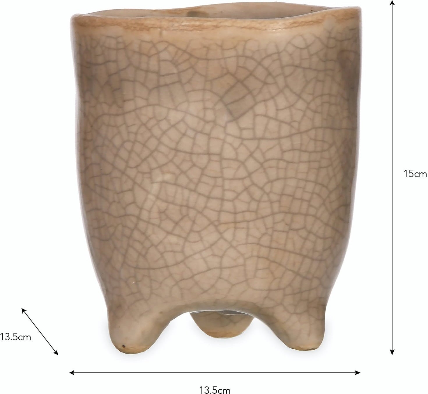 De prachtige bloempot springt echt in het oog! Hij is ontworpen met een prachtig rustiek glazuur in een zachte steenkleur en is gemaakt van keramisch materiaal. Er zit een rubberen pad op elke poot voor een stevige stand en om krassen op je meubels te voorkomen. Laat je cactussen of vetplanten op hun mooist uitkomen!