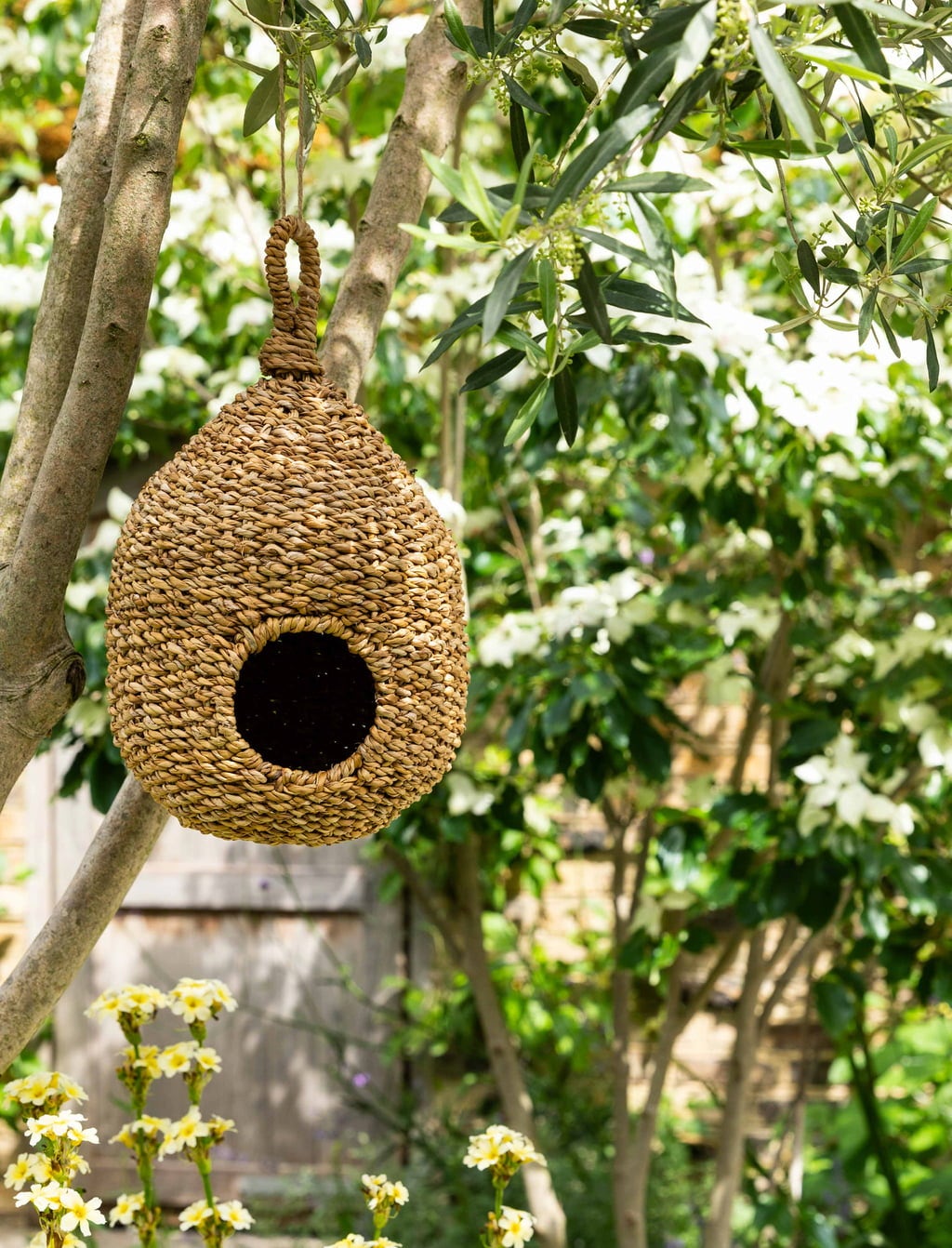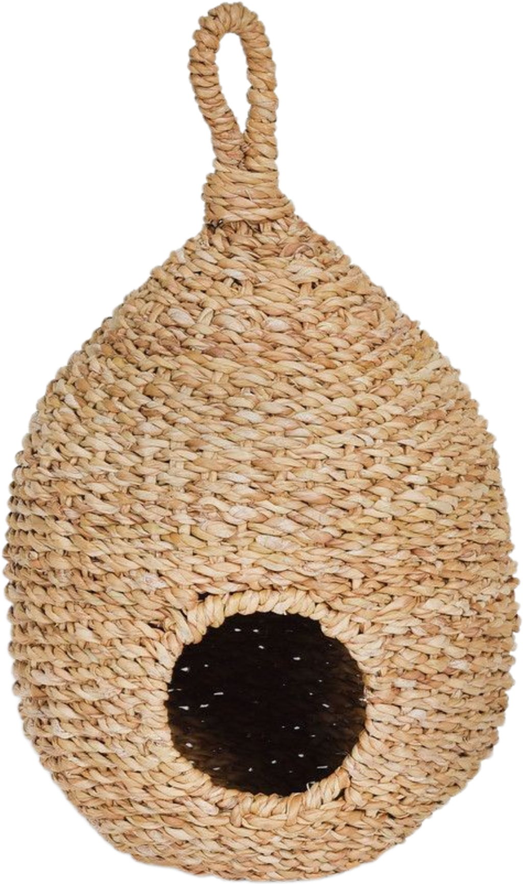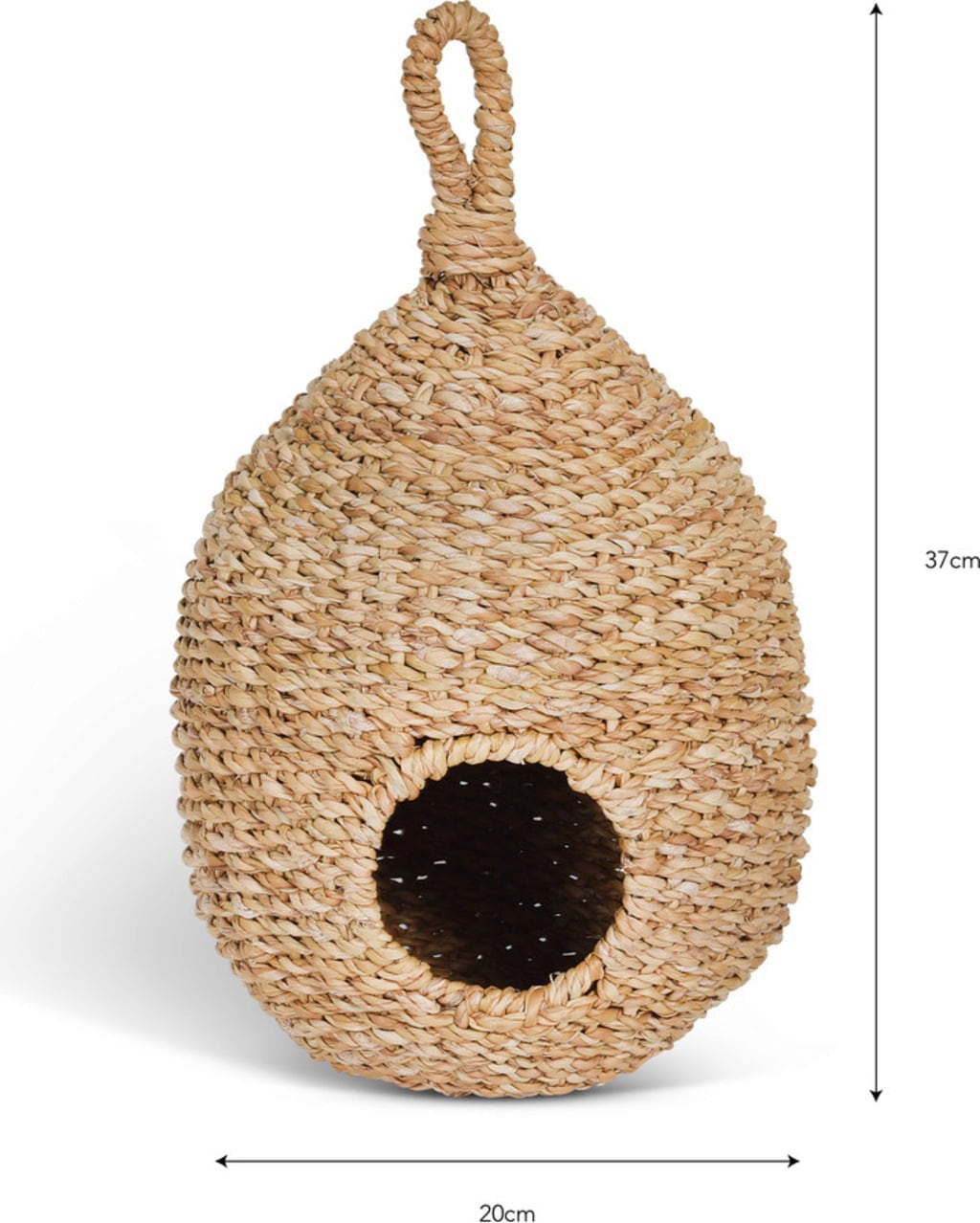Het handgemaakte vogelhuisje van zeegras is met veel aandacht voor detail gemaakt. Het biedt tuinvogels een gezellig toevluchtsoord om te nestelen of zich te warmen in de koude wintermaanden. Een beschutte plek tussen takken of een overhangend dak is ideaal.