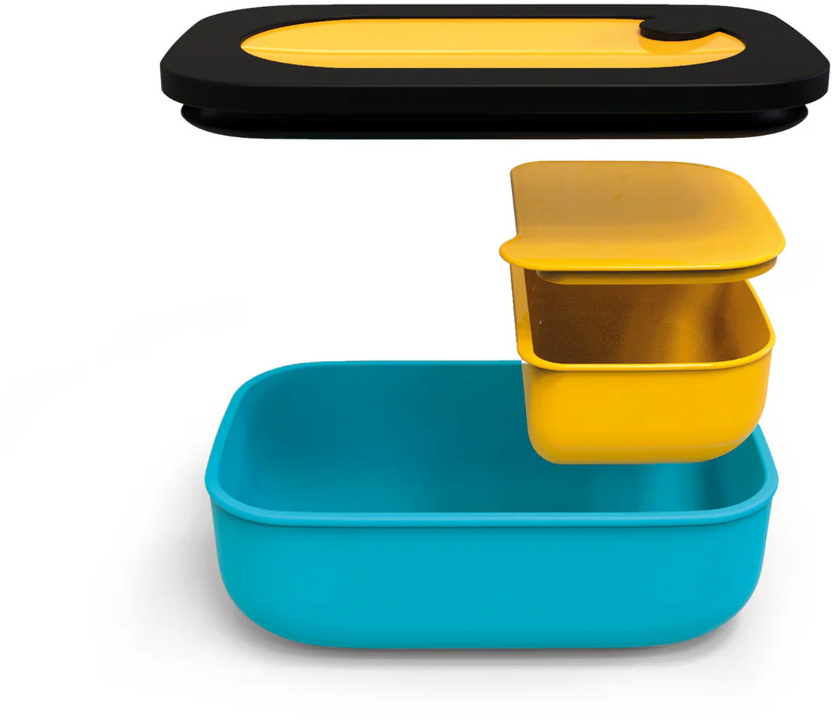 Deze snackbox bestaat uit twee rechthoekige bakjes die in elkaar gestapeld kunnen worden, een goed sluitende deksel en bestek. Hij is zo ontworpen dat verschillende etenswaren vervoerd kunnen worden zonder dat ze mengen of smaakvervuiling veroorzaken. De box kan gebruikt worden in de koelkast of vriezer, is vaatwasmachinebestendig en is ook magnetronbestendig dankzij de deksel met klep.