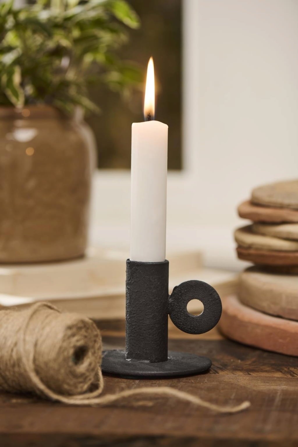 Rustieke metalen kandelaar die mooi staat als decoratief element of in combinatie met andere woonaccessoires.
