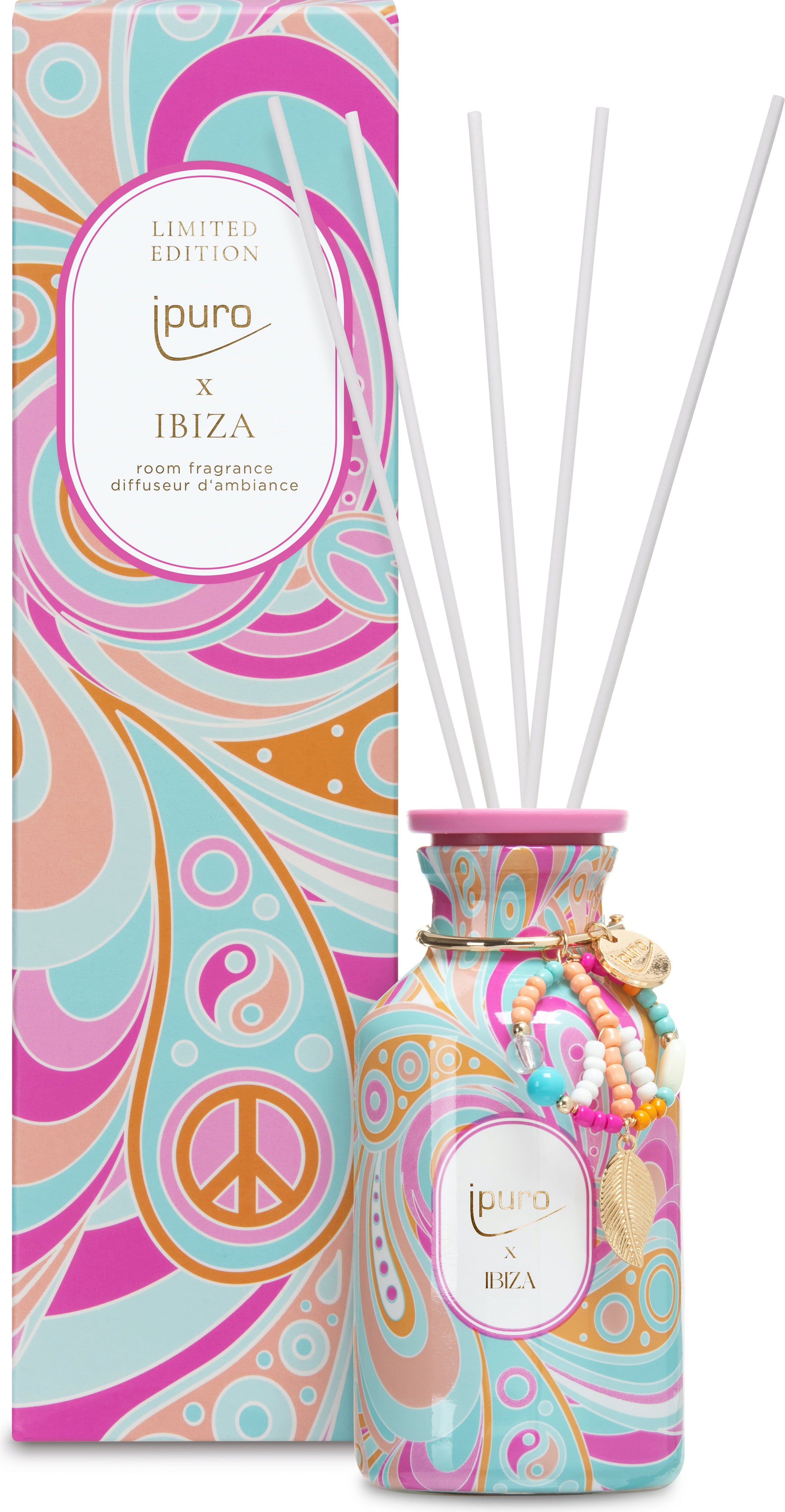 De Ibizia interieurgeur van ipuro brengt levendige geuren en een vakantiegevoel in je leefruimte. Bloemige, poederachtige nuances vermengen zich met licht houtachtige aroma's.