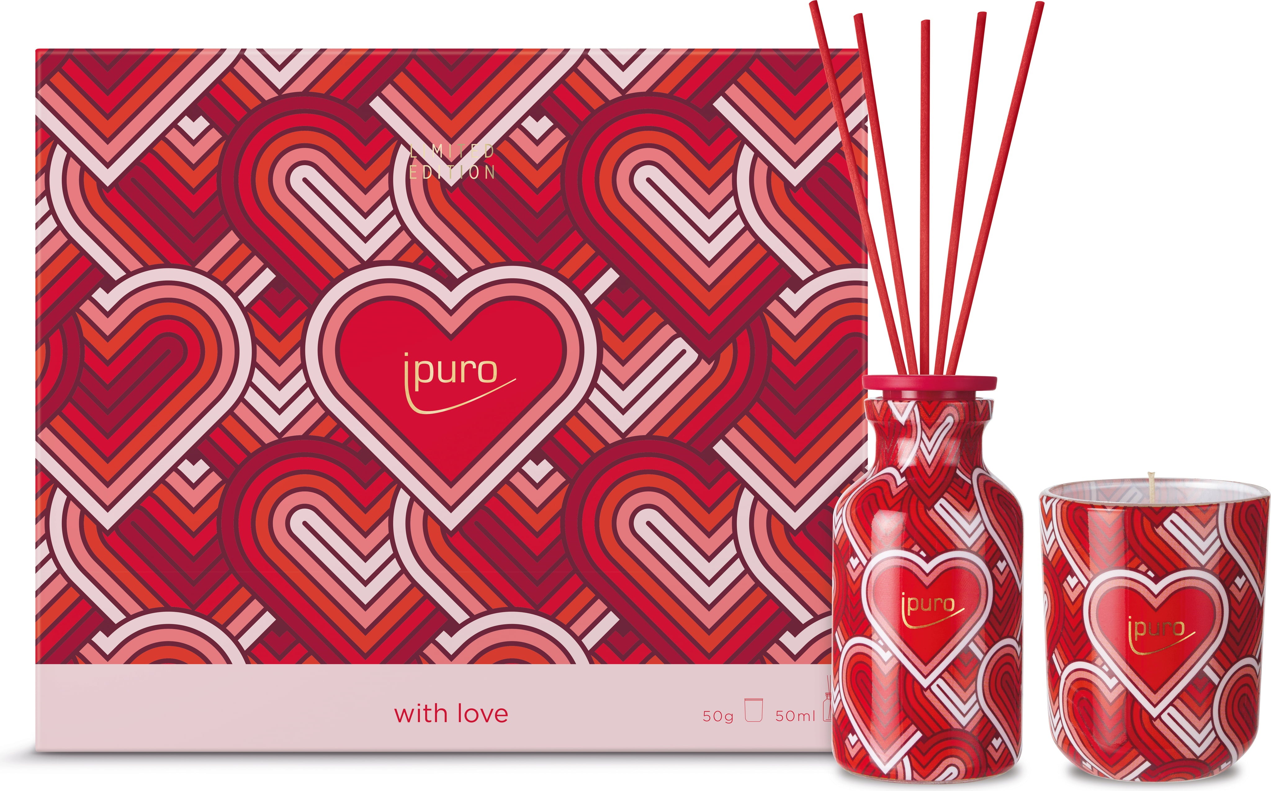 De With Love interieurgeurset van ipuro bevat een interieurgeur met geurstokjes en een geurkaars. De set straalt een frisse bloemengeur uit met noten van grapefruit, citroen, cyclamen, jasmijn, roos, muskus en cederhout.