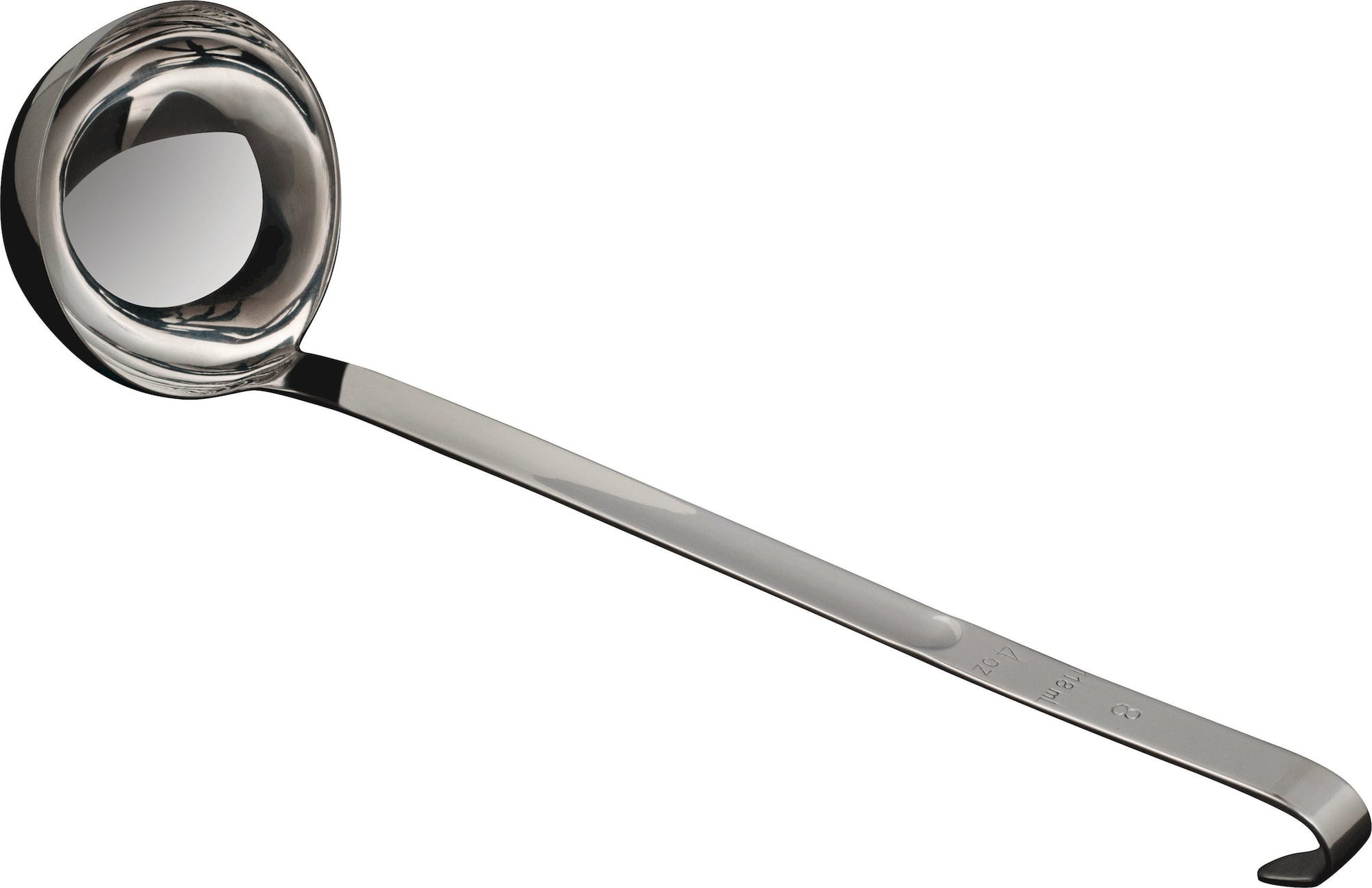 Deze elegante pollepel is gemaakt van roestvrij staal. Het is verkrijgbaar in verschillende maten en heeft zelfs maatmarkeringen op het handvat. Het gebogen uiteinde maakt het gemakkelijk om op te hangen.