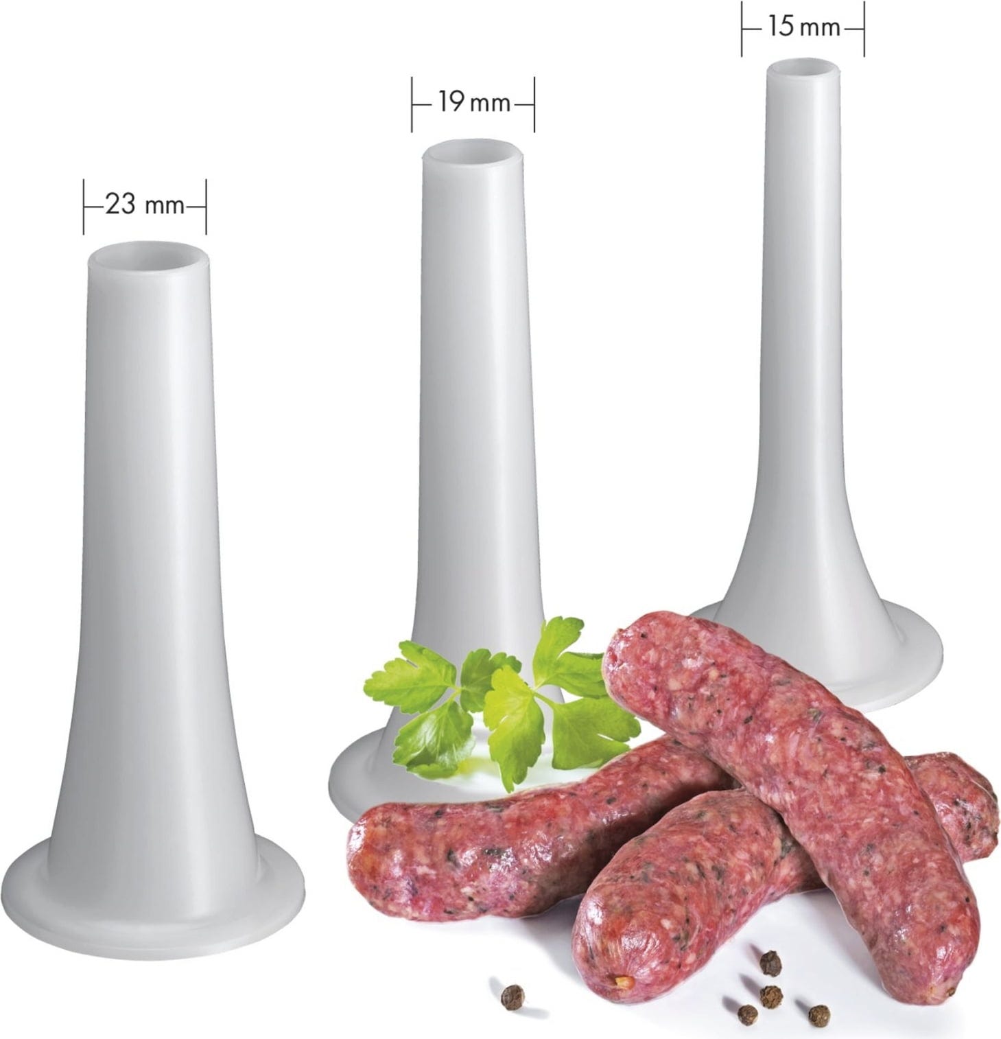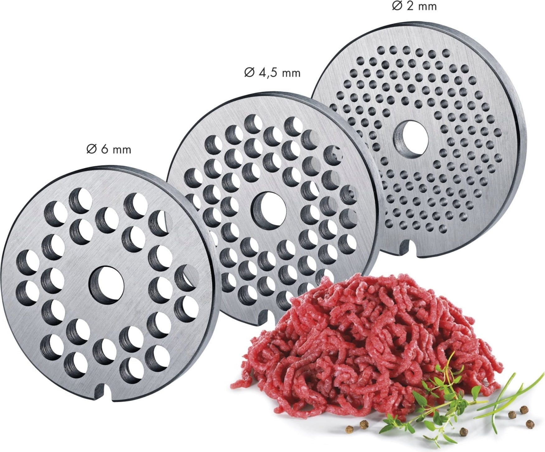 Leveringsomvang: vleesmolen, 3 geperforeerde schijven van messenstaal (2/ 4,5/ 6 mm), 3 worstopzetstukken (15/ 19/ 23 mm), zandkoekopzetstuk (4 verschillende vormen)