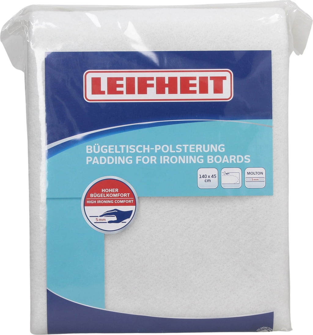 De 5 mm dikke Molton strijkplankonderlaag van LEIFHEIT zorgt voor extra onderlegger op de strijkplank, waardoor het strijkijzer gemakkelijker over kleding glijdt en minder vlekken achterlaat. Dankzij de afmetingen van 140 x 45 cm kan de onderlegger worden aangepast aan de grootte van je strijkplank.
