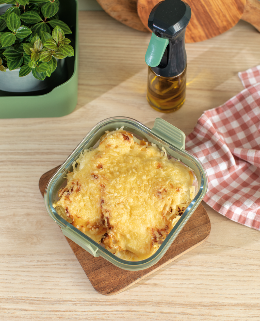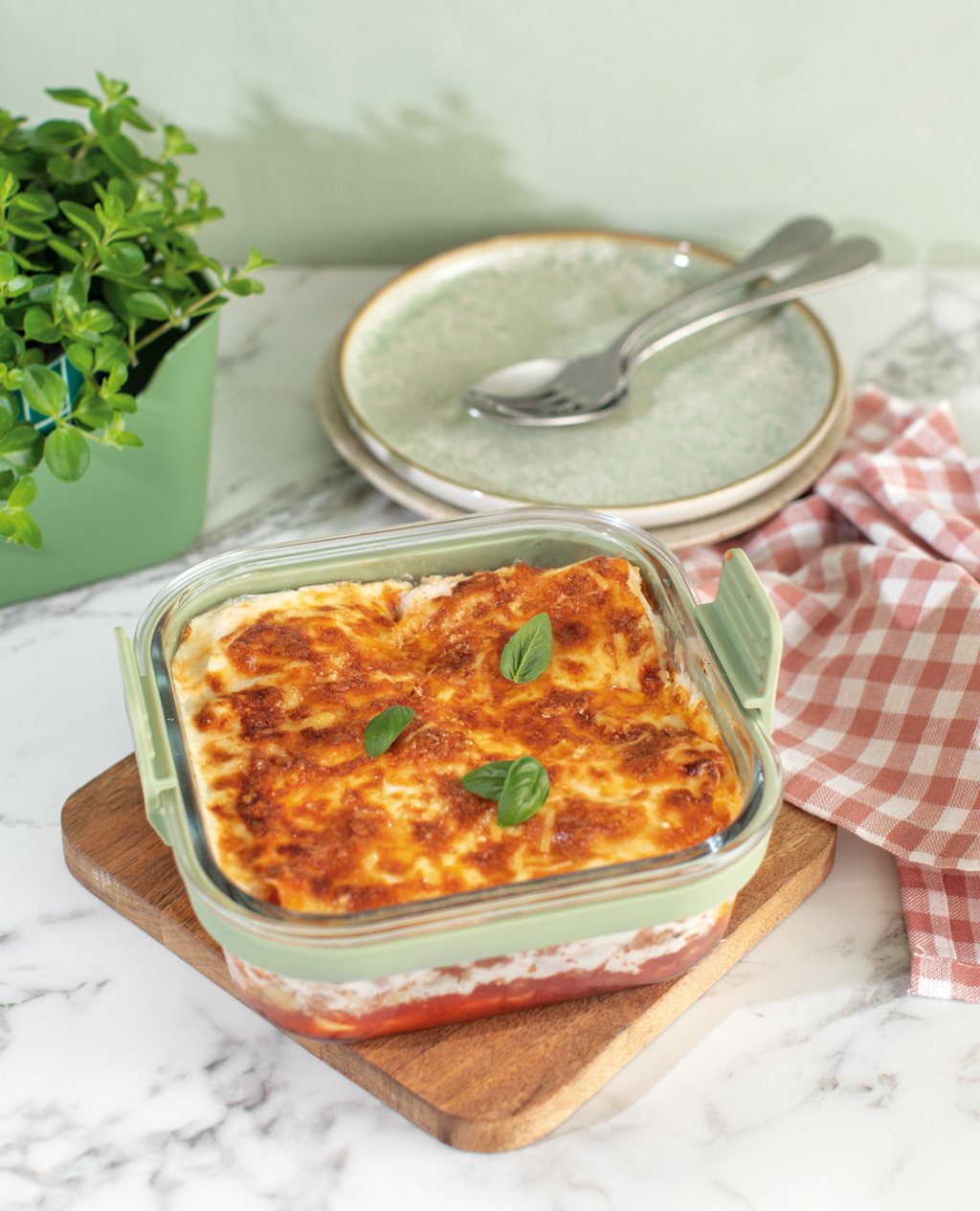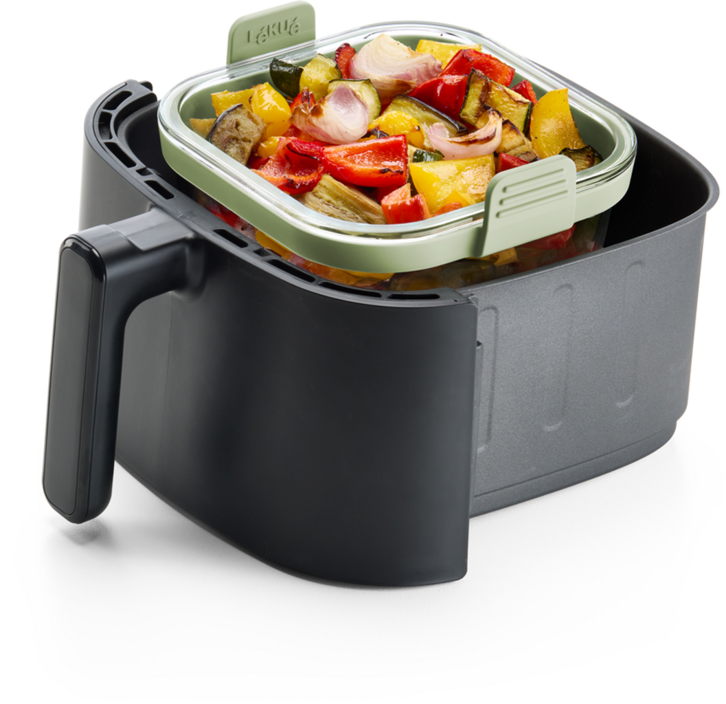 Deze slimme allrounder van robuust borosilicaatglas is niet alleen perfect voor een zachte bereiding in de airfryer, maar kan natuurlijk ook in de oven of magnetron worden gebruikt. Dankzij het minimalistische ontwerp met afneembare handgrepen kan het ook direct op tafel worden geserveerd.
