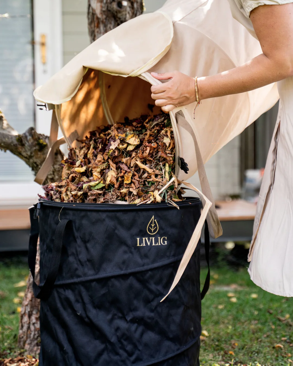 De twee lange draaghengsels maken het gemakkelijk om de volle zak naar de compostbak of de bak met organisch afval te brengen. En als je hem niet nodig hebt, kan hij heel klein worden opgevouwen en opgeborgen om ruimte te besparen.
