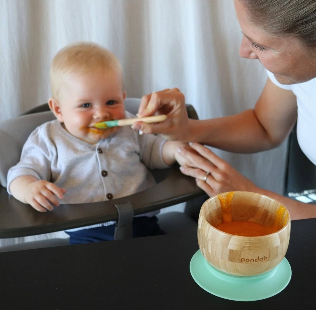 De set wordt gecompleteerd door twee bamboelepels met zachte siliconen uiteinden in turquoise en geel, die dankzij hun handige en gemakkelijk vast te pakken ontwerp perfect zijn voor kleine kinderhandjes!