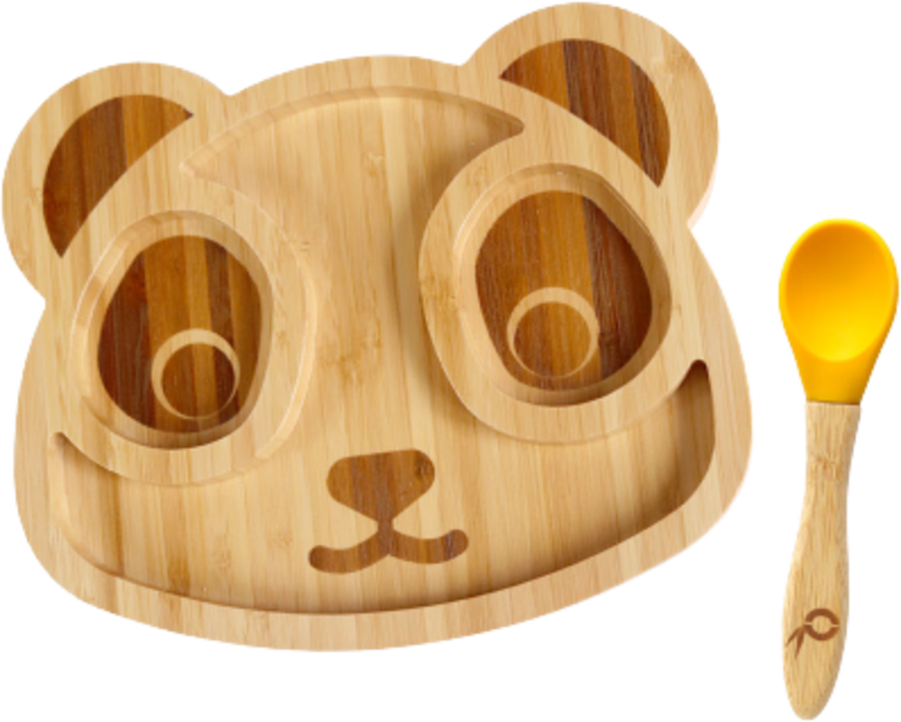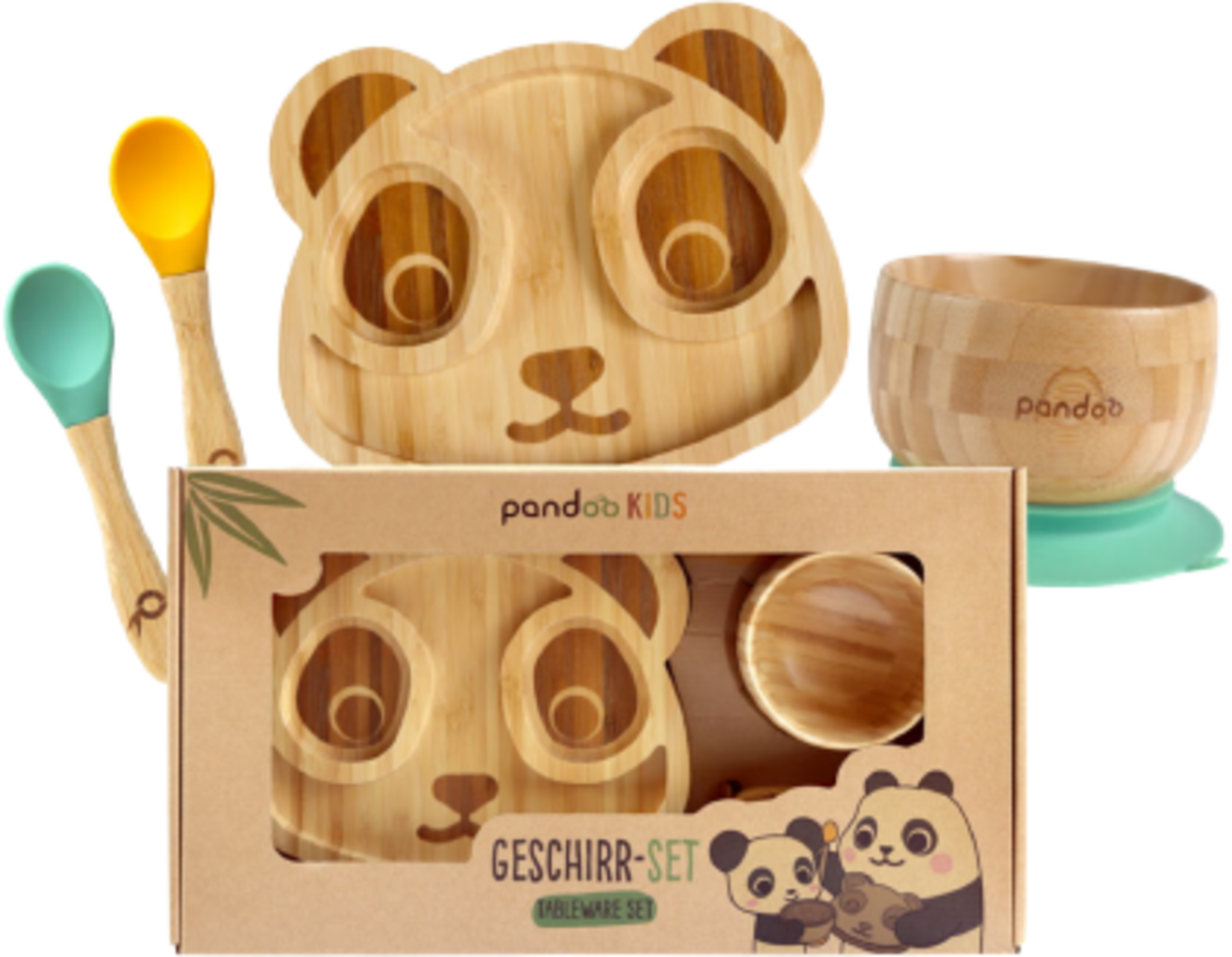 De liefdevol vormgegeven set bestaat uit een bamboebord in de vorm van een pandagezicht en een bamboekom, die beide veilig en antislip op tafel staan ​​dankzij slimme onderstellen met turquoise en gele siliconen.