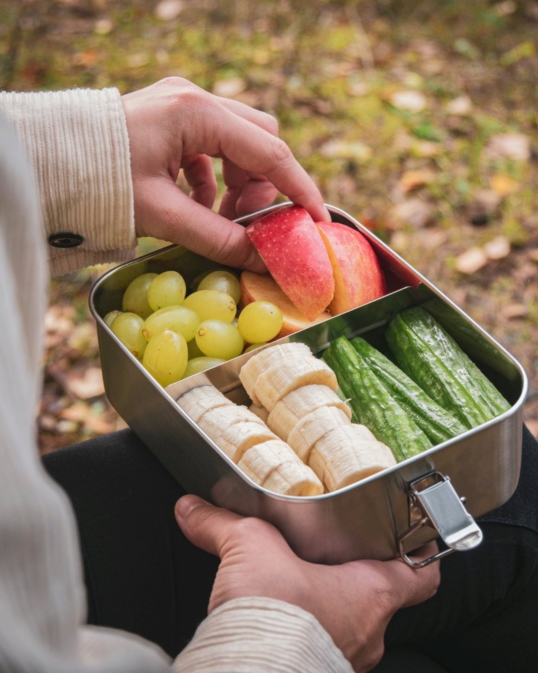 Deze stijlvolle roestvrijstalen lunchbox heeft een praktische verdeler waarmee je verschillende etenswaren kunt scheiden. De BPA-vrije siliconen afdichting houdt de container luchtdicht.