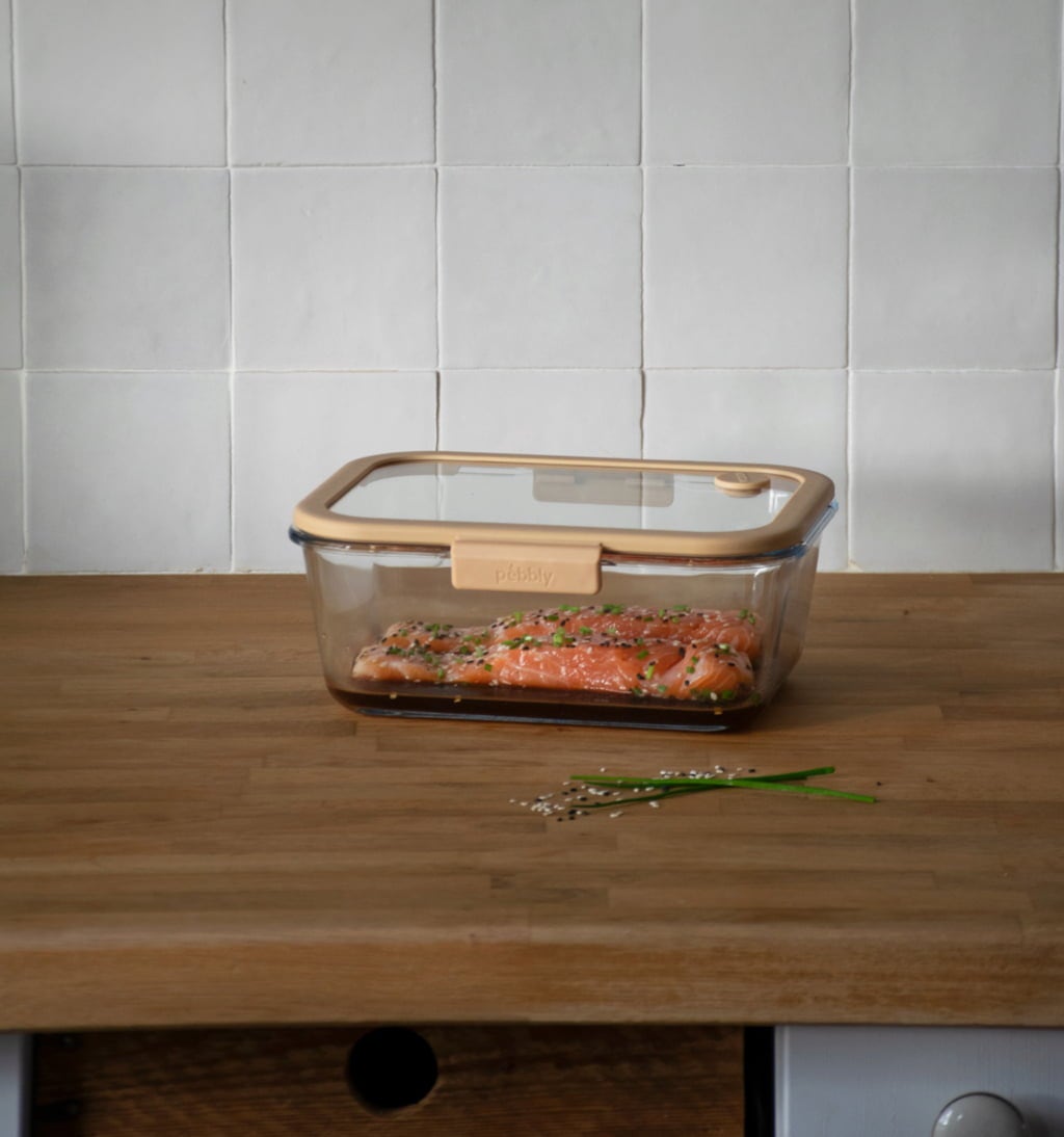 De apart verkrijgbare Pebbly vacuümpomp kan worden gebruikt om lucht en vocht uit de bakjes te zuigen. Dit verlengt de houdbaarheid van de levensmiddelen nog verder.