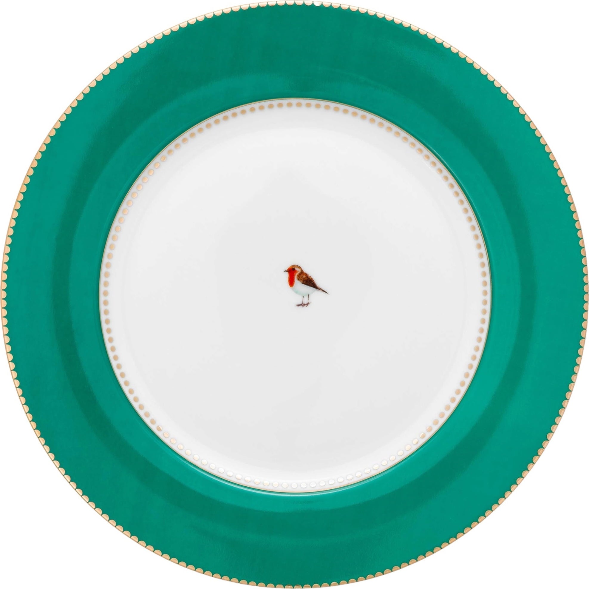 Met deze schattige bordjes van Pip Studio kun je de tafel prachtig dekken! Een groene rand en gouden details omlijsten het schattige roodborstje in het midden en creëren een even elegant als vertederend ontwerp. Het bord is gemaakt van fijn porselein, is een chique blikvanger op elke eettafel en is ook ideaal om te combineren met andere producten uit de Love Birds collectie!