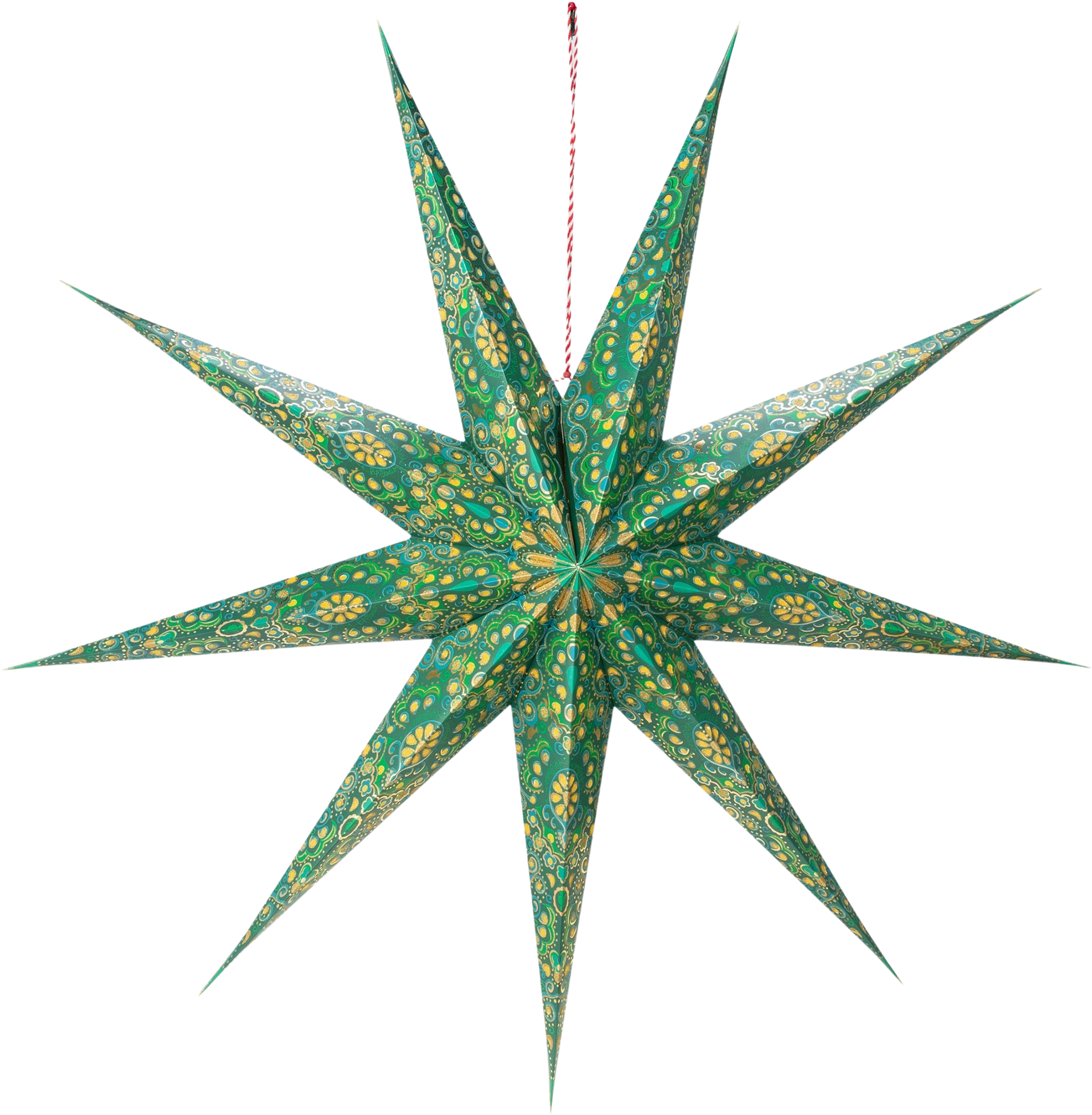 Hij valt op door zijn elegante en verfijnde design, met een diepe, stijlvolle groene tint als basis. Verfijnde patronen in luxueus goud en dieper rood geven het ontwerp zijn feestelijke uitstraling. De zorgvuldig gevouwen, spitse punten zorgen voor een indrukwekkende driedimensionale diepte en een gracieuze vorm.