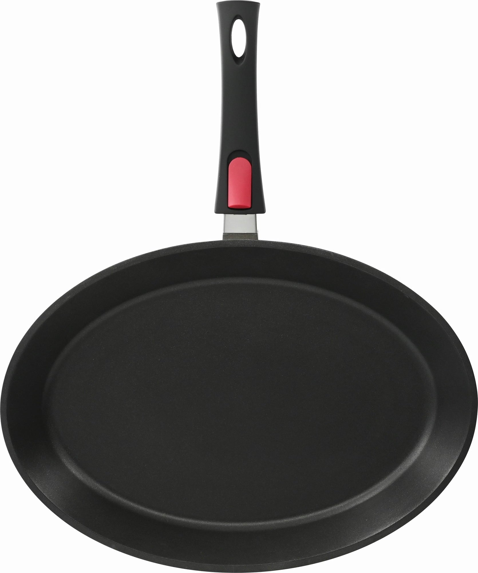 De KELOMAT viskoekenpan heeft een ovale vorm en is ideaal voor het bereiden van alle soorten vis. De pan heeft een afmeting van 39 x 27 cm en een afneembare handgreep, waardoor het ook geschikt is voor gebruik in de oven.