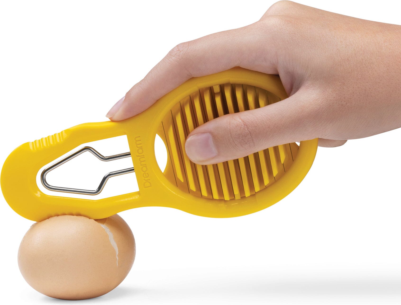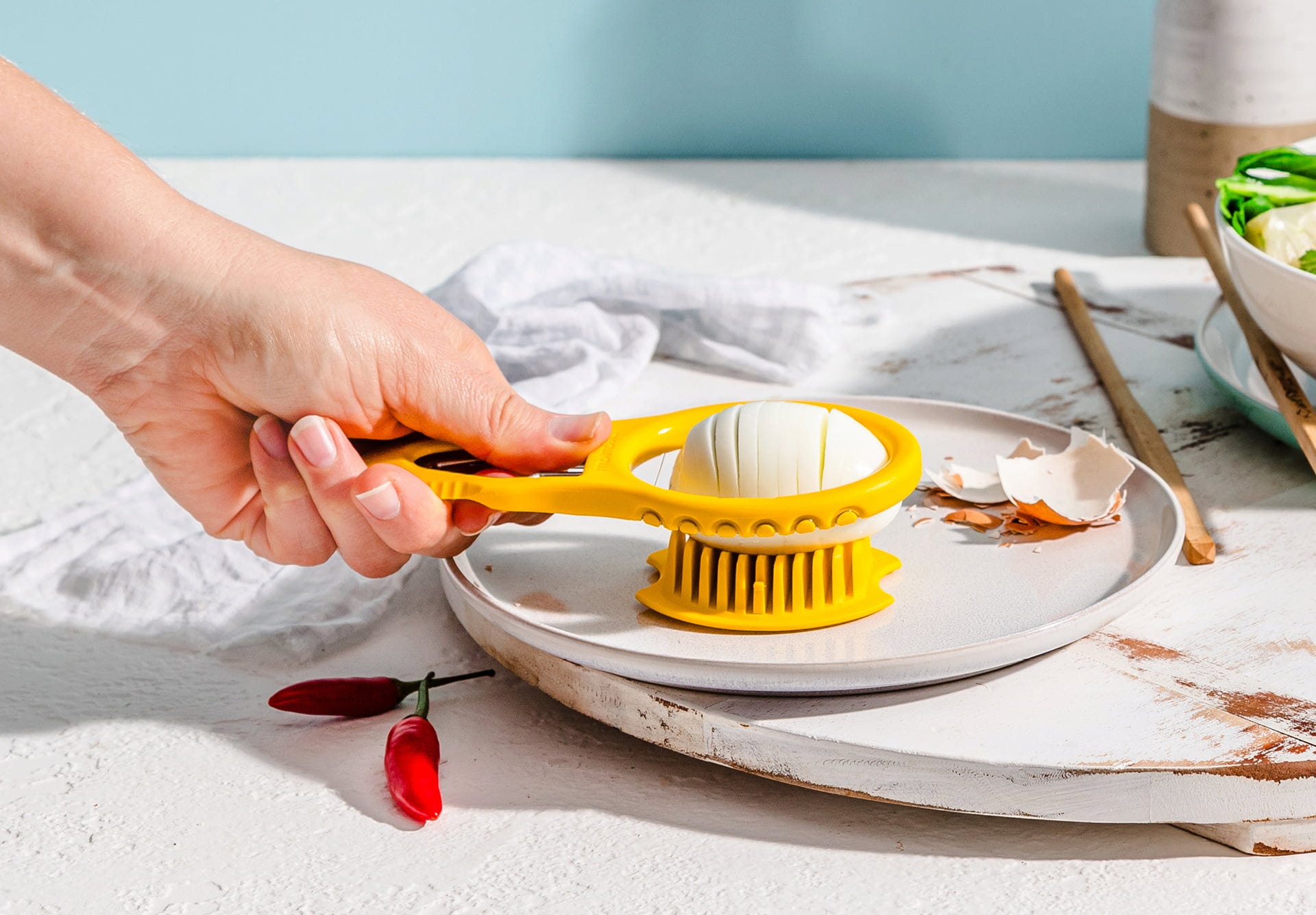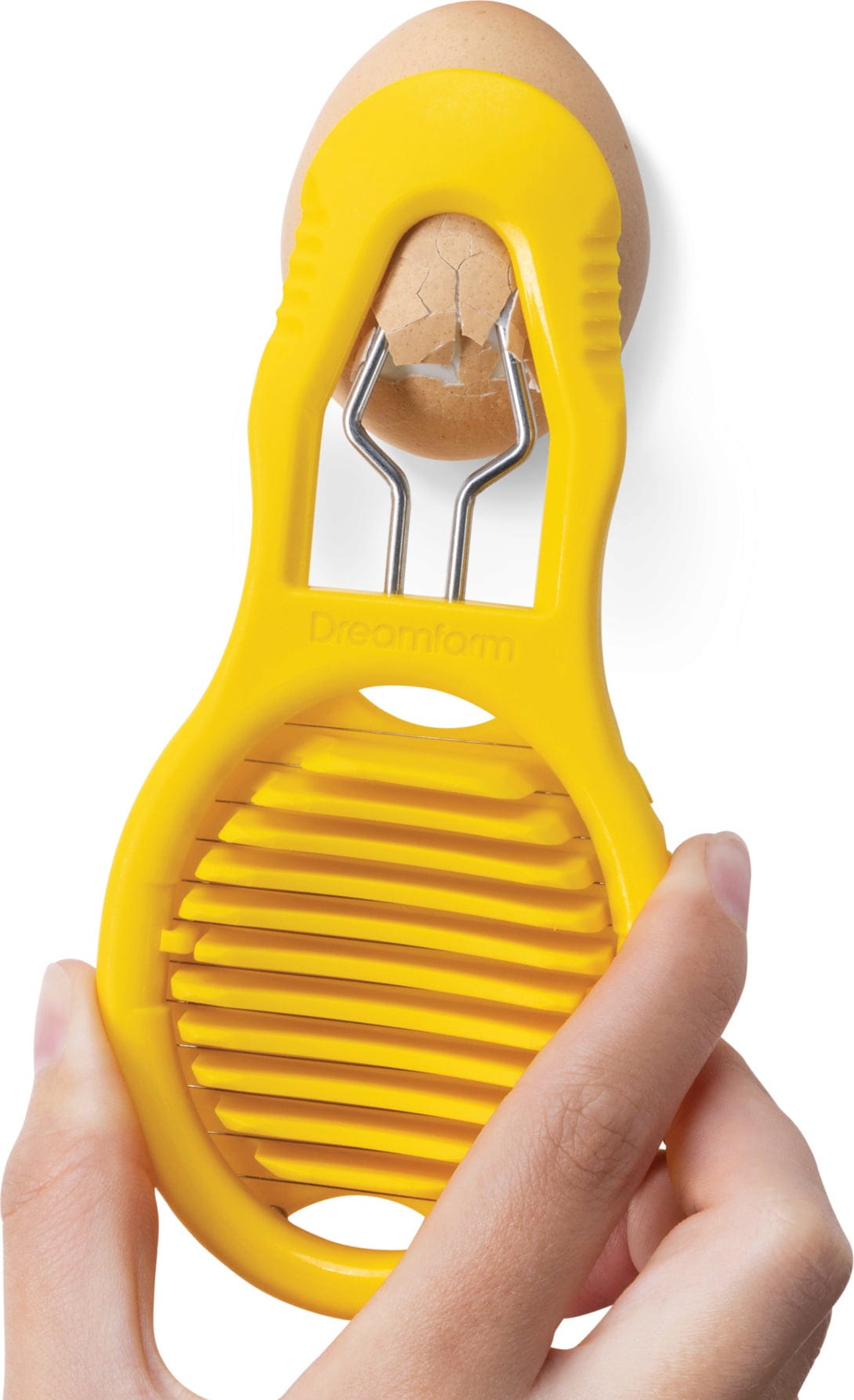 Met de Eierschiller & -snijder Eggler van Dreamfarm wordt het bereiden van hardgekookte eieren een schone bezigheid in slechts drie stappen. Eerst breek je de schaal nauwkeurig open met de geïntegreerde breeksnijder, waarna de flexibele siliconenrand de schaal zachtjes en zonder vervelende resten van het ei verwijdert. Zodra het ei geschild is, tover je met de hoogwaardige roestvrijstalen snijring in een handomdraai gelijkmatige, decoratieve schijfjes voor je sandwich of salade! Bovendien is de Eggler heerlijk robuust en ruimtebesparend.