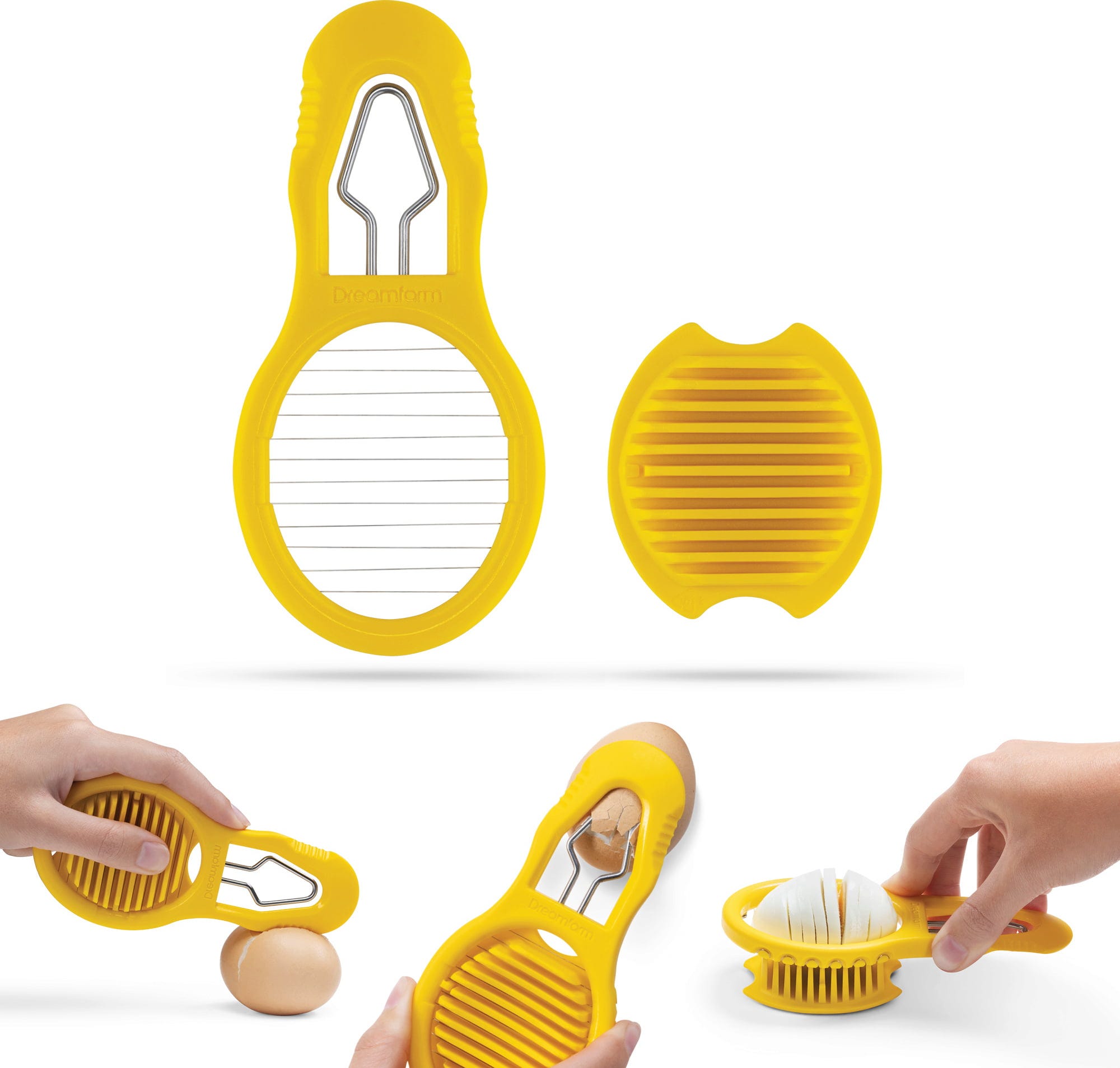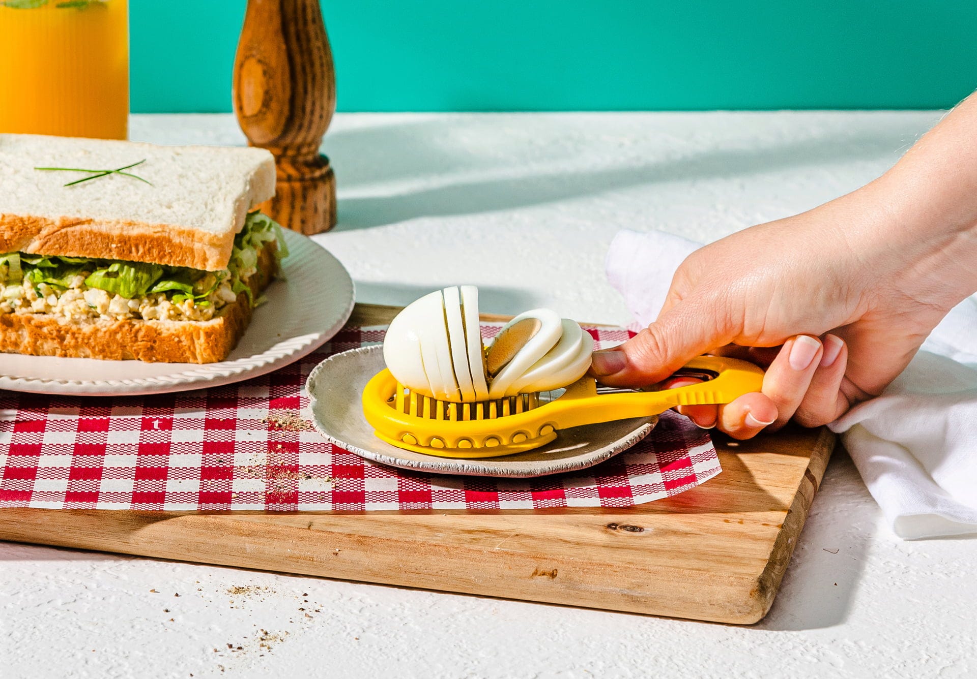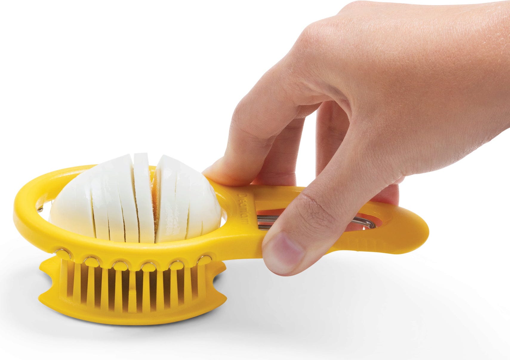 Met de Eierschiller & -snijder Eggler van Dreamfarm wordt het bereiden van hardgekookte eieren een schone bezigheid in slechts drie stappen. Eerst breek je de schaal nauwkeurig open met de geïntegreerde breeksnijder, waarna de flexibele siliconenrand de schaal zachtjes en zonder vervelende resten van het ei verwijdert. Zodra het ei geschild is, tover je met de hoogwaardige roestvrijstalen snijring in een handomdraai gelijkmatige, decoratieve schijfjes voor je sandwich of salade! Bovendien is de Eggler heerlijk robuust en ruimtebesparend.