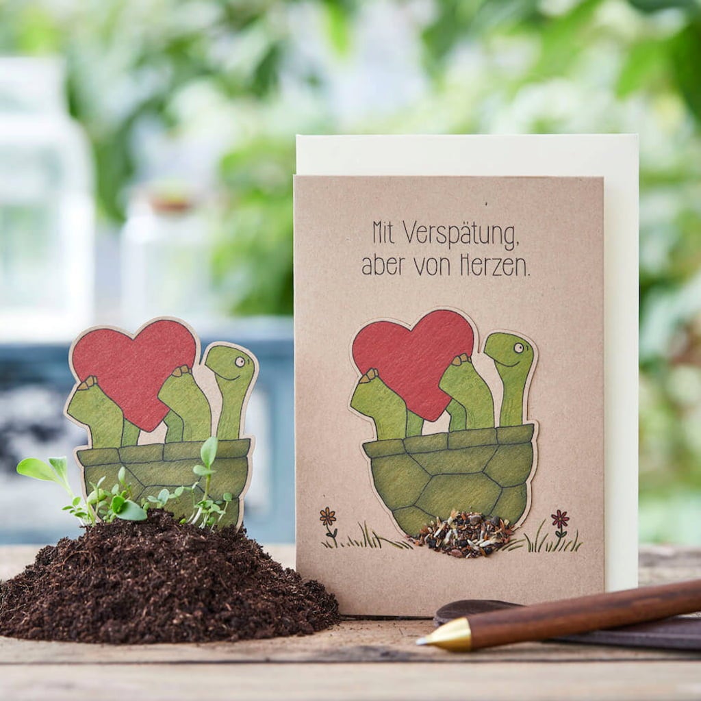 Omdat schildpadden niet de snelste zijn, kan het helaas iets langer duren voordat de felicitaties binnenkomen. De vreugde is echter nog groter als de persoon die de kaart overhandigt net zo lief is als deze kaart. En het allerleukste: het schildpadje brengt naast felicitaties ook veel zaadjes mee waaruit de mooiste wilde bloemen groeien. Verwijder eenvoudigweg de schildpad van de kaart, plaats hem in de grond en geef hem goed water. De eerste zachte scheuten zouden na korte tijd moeten verschijnen.