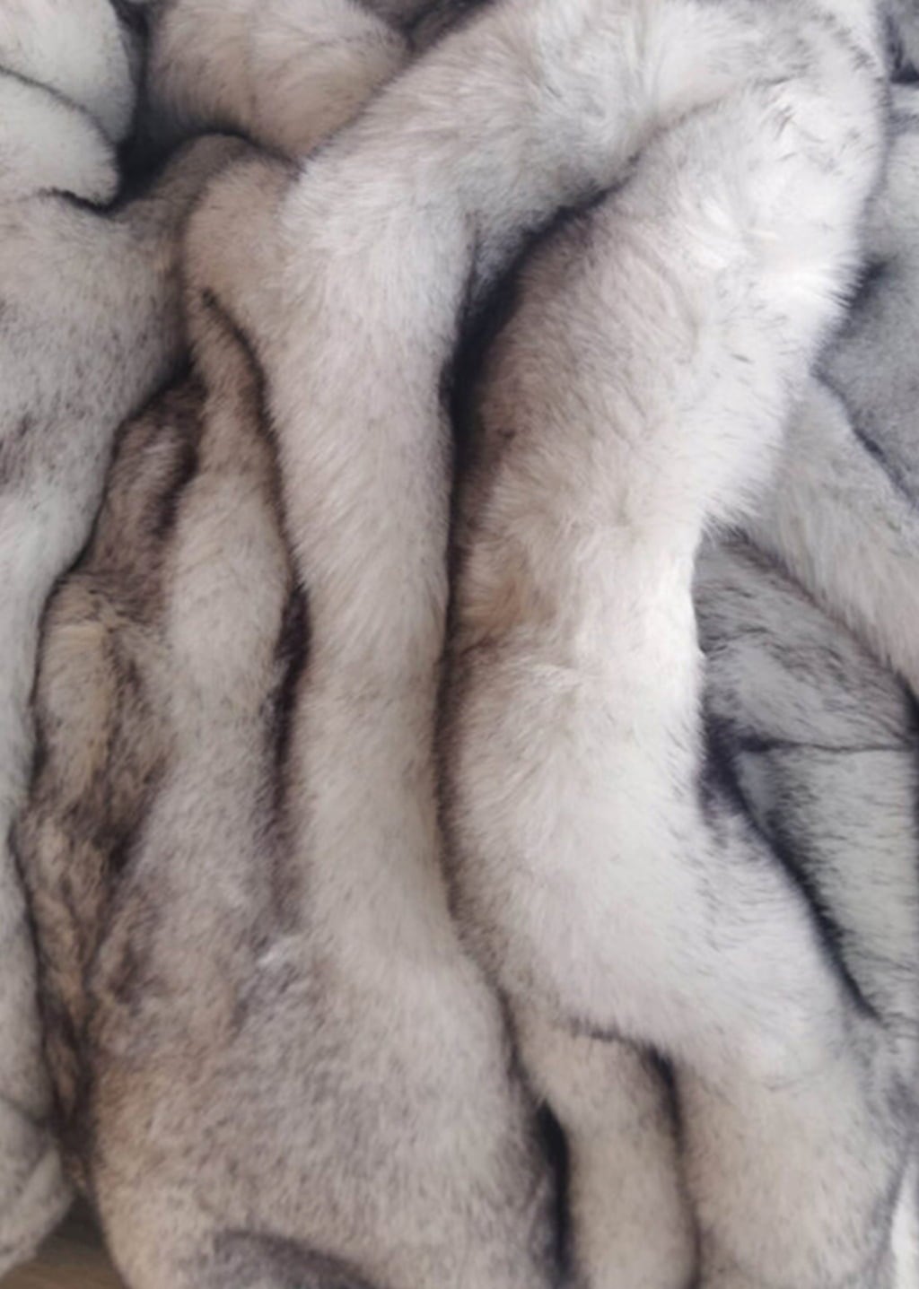 Deze prachtige deken van imitatiebont maakt niet alleen indruk door zijn royale afmetingen, maar ook door zijn prachtige kleurenspel. Afhankelijk van de lichtinval glanst hij in zilver of lichtgrijs, terwijl de uiteinden in geraffineerd titanium zijn uitgevoerd.